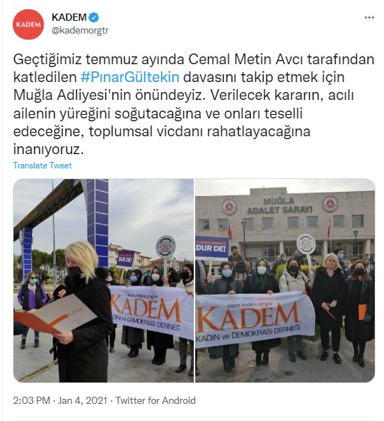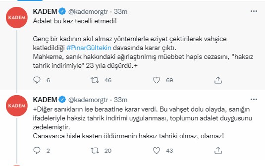 Kadın ve Demokrasi Derneği (KADEM): "Adalet bu kez tecelli etmedi! Genç bir kadının akıl almaz yöntemlerle eziyet çektirilerek vahşice katledildiği Pınar Gültekin davasında karar çıktı. Mahkeme, sanık hakkındaki ağırlaştırılmış müebbet hapis cezasını, 'haksız tahrik indirimiyle' 23 yıla düşürdü."