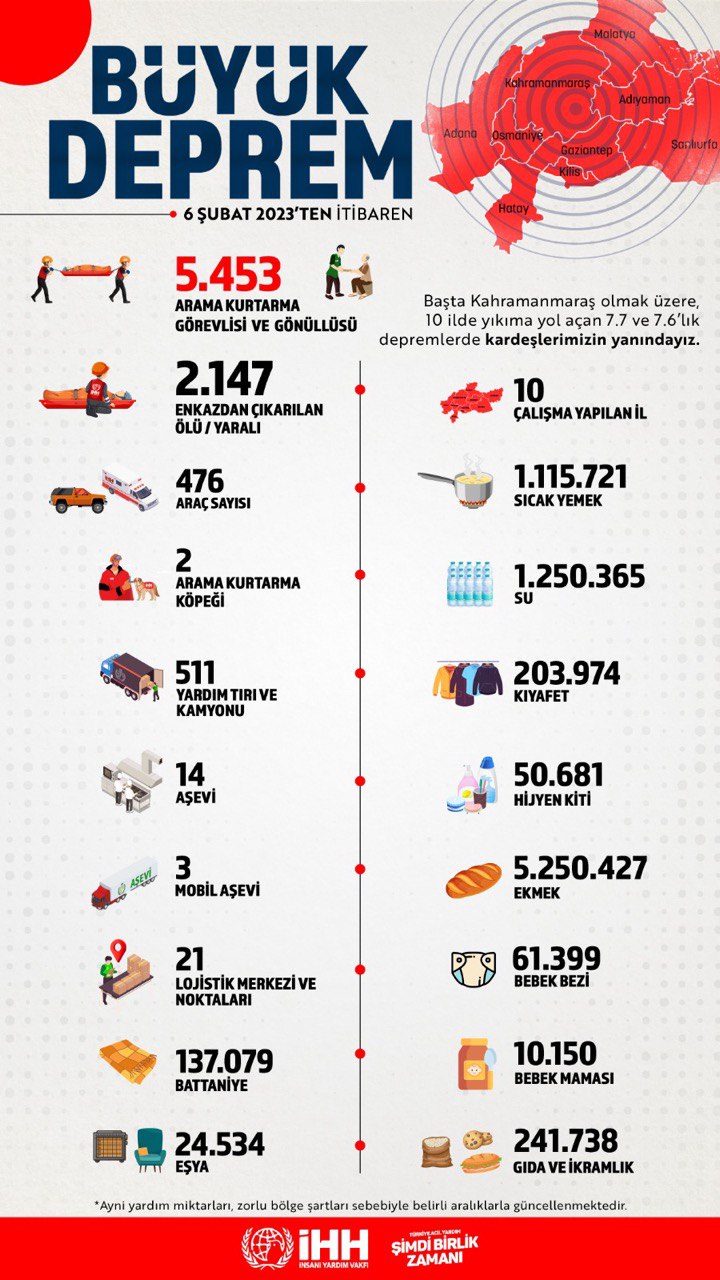 İHH İnsani Yardım Vakfı'ndan yapılan açıklamada, "Başta Kahramanmaraş olmak üzere, 10 ilde yıkıma yol açan 7.7 ve 7.6'lık depremlerde desteklerinizle ve tüm imkanlarımızla kardeşlerimizin yanındayız." mesajı verildi.