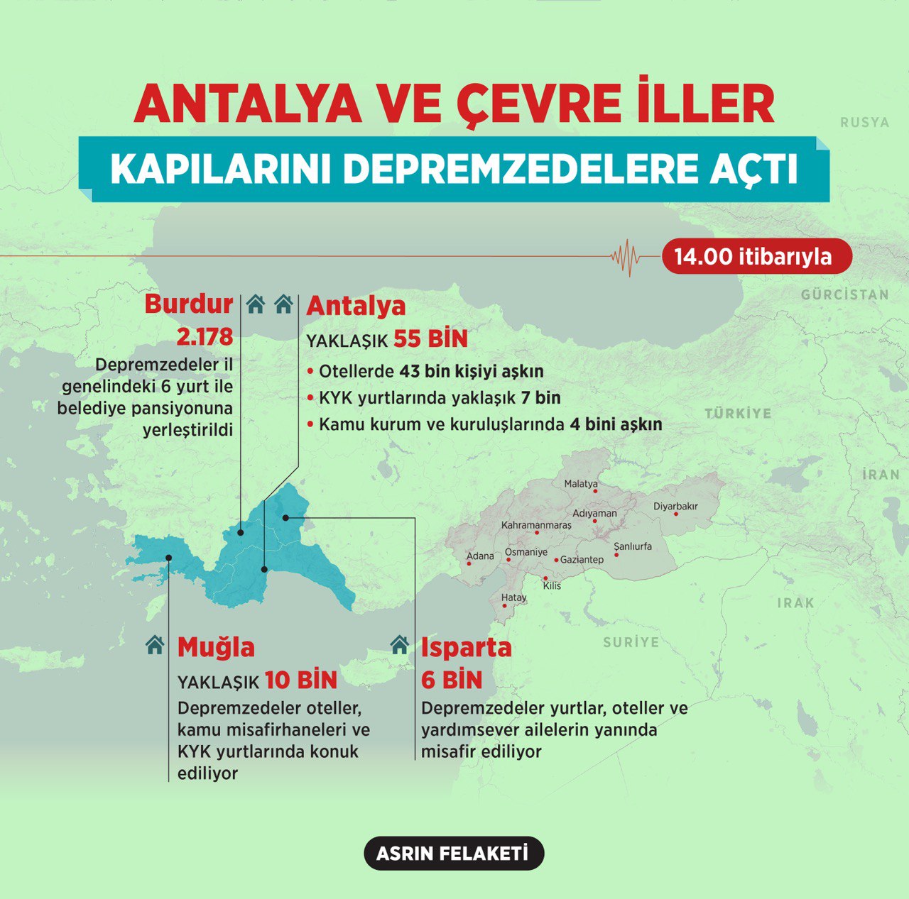 "Asrın felaketi" olarak nitelenen, Kahramanmaraş merkezli, 10 ili etkileyen depremlerin ardından Antalya, Muğla, Isparta ve Burdur'a gelen depremzedeler, kentlerdeki oteller, kamuya ait misafirhaneler ve yurtlara yerleştirildi.