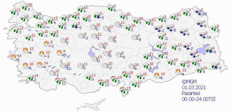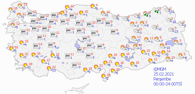 Karadeniz kıyıları, İstanbul, Kocaeli, Yalova ve Kastamonu'nun kuzey ilçeleri ile Sinop çevrelerinin yağmurlu, Ardahan çevreleri ile Artvin'in yüksek kesimlerinin karla karışık yağmur ve kar yağışlı, diğer yerlerin az bulutlu ve açık geçeceği tahmin ediliyor.