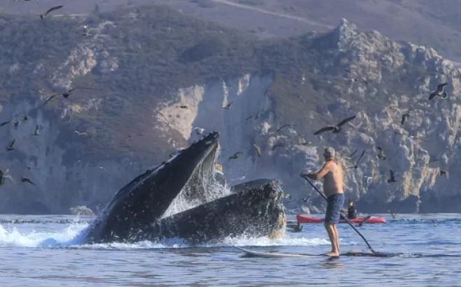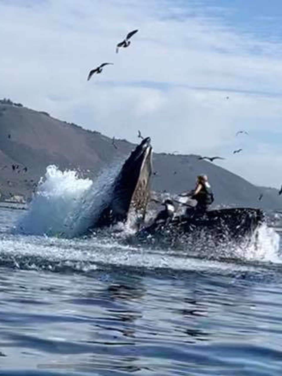 ABD'nin Kaliforniya eyaletindeki Avila sahilinde balina izleyen iki kanocu tehlikeli anlar yaşadı. Liz Cottriel ve Julie McSorley pazartesi günü sahile yakın bir noktada kambur balinayı yaklaşık 9 metre mesafeden izliyordu. Fakat suyun ortasında beliren büyük bir balık grubuyla her şey değişiverdi.