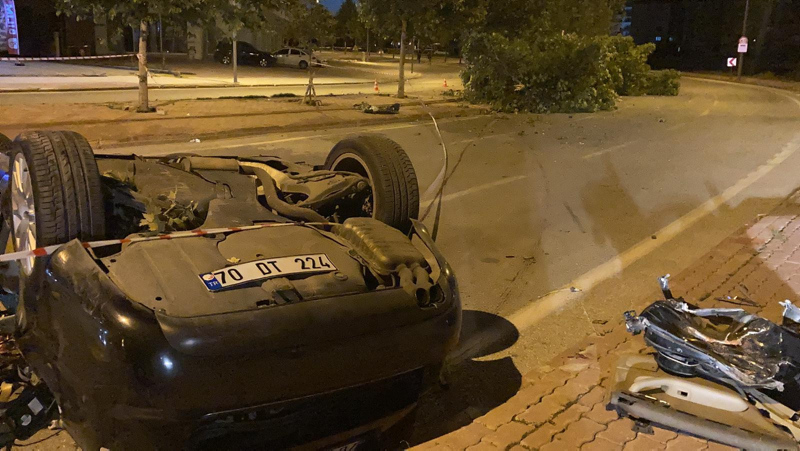 Mehmet Demirel hakimiyetindeki 70 DT 224 plakalı araç, şoförünün direksiyon hakimiyetini kaybetmesiyle refüjdeki ağaçları kırıp takla attı.