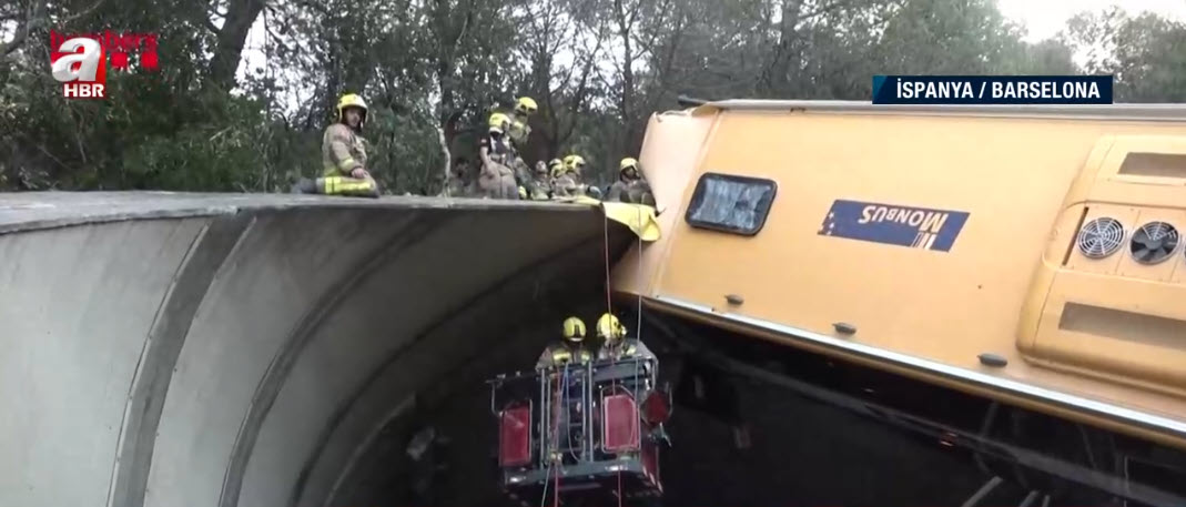 Barselona'da görenleri hayrete düşüren bir kaza meydana geldi. 60 yolcunun bulunduğu servis aracı bakın tünel girişinde nasıl dik olarak asılı kaldı...