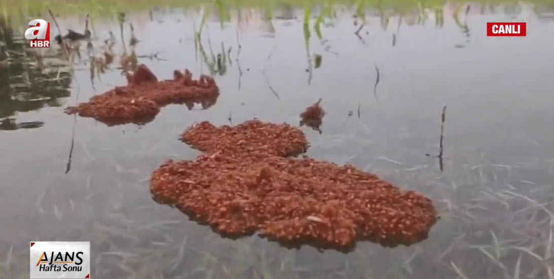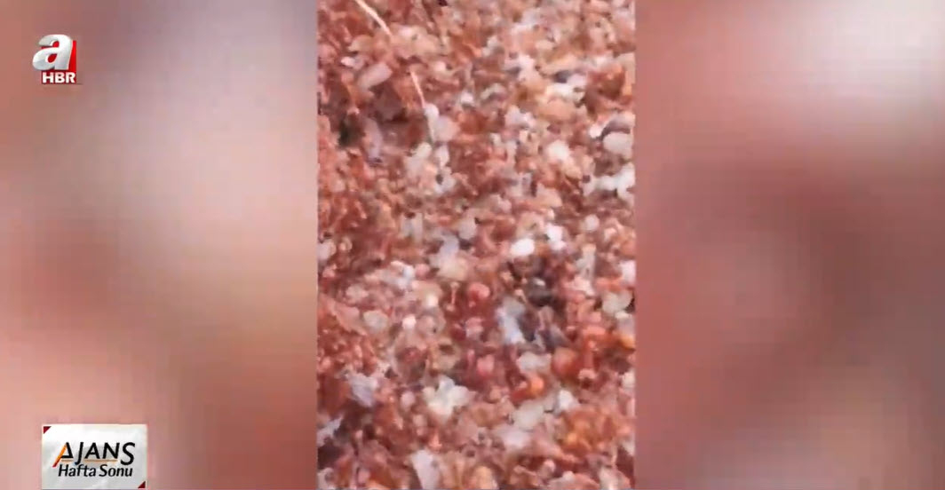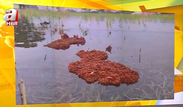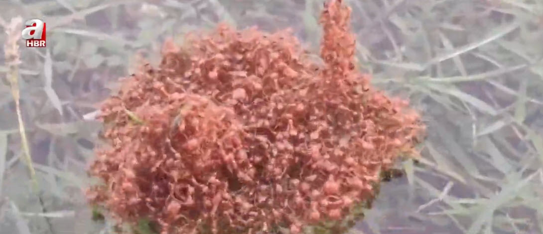 Bir kırımızı karınca kolonisi sular altında kalan tarlada boğulmamak için birbirlerine yapışarak sal halini aldı. Görenleri hayrete düşüren görüntüler Hindistan'da kaydedildi. Karıncalar bu yöntemle haftalarca yüzebiliyor.