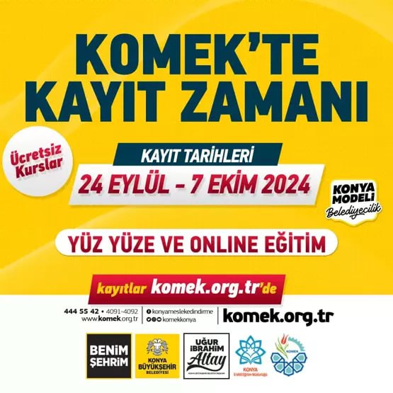 KOMEK kayıt başvuruları, katılımcıların eğitim almak istedikleri alanlara göre farklı platformlar üzerinden gerçekleştiriliyor. Yüz yüze eğitim almak isteyenler için kayıt işlemleri buradan yapılırken, uzaktan eğitim için bu bağlantıyı kullanmaları gerekiyor. KOMEK kursları tamamen ücretsizdir.