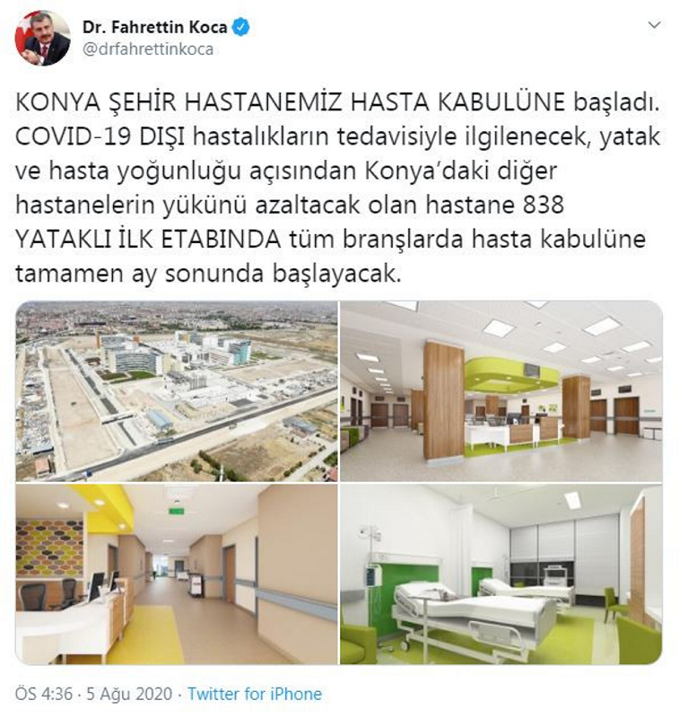 Başkan Recep Tayyip Erdoğan'ın "Hayalim" dediği şehir hastanelerinden biri olan bin 250 yatak kapasiteli Konya Şehir Hastanesi, pandemi sürecinde tamamlanarak hasta kabulüne başladı. Kamu-özel ortaklığı modeliyle yapımı tamamlanan Anadolu'nun en büyük şehir hastanesinin 130'u yoğun bakım yatağı olan 838 yataklı ilk etabı hizmete açıldı.