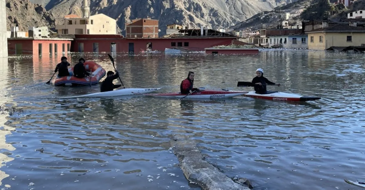 Koşup oynadıkları sokaklarda bu kez kürek çektiler! Yusufeli'nde su seviyesi 100 metreye yaklaştı