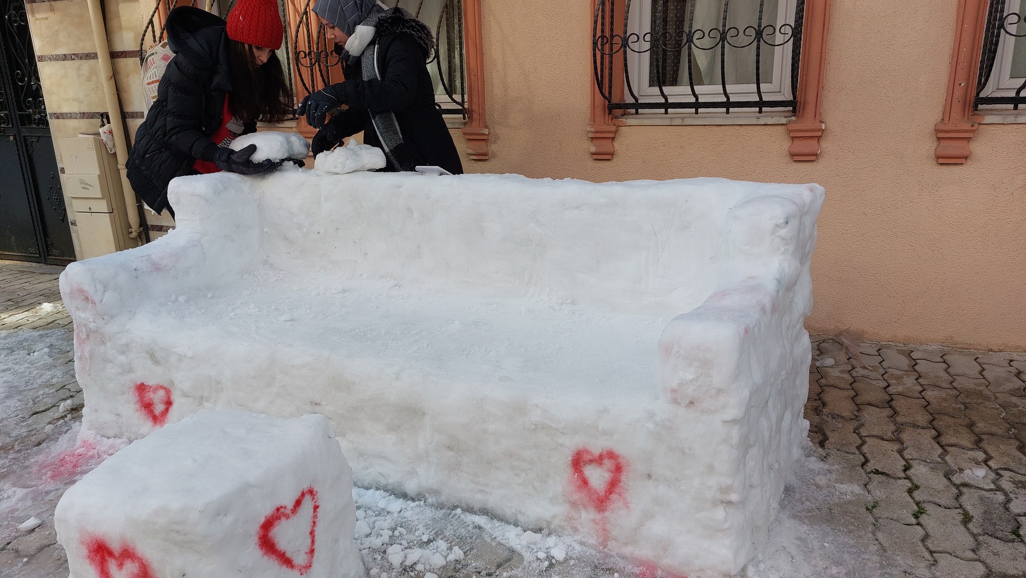 Kar yağışını çocuklar ve kadınlarla fırsata çevirmek istediklerini anlatan Didem Sesli, "Kar yağınca çocuklar ne yapalım diye düşündük ve aklımıza böyle bir fikir geldi. Yazın oturduğumuz yerde, kardan kanepe yapalım dedik. Yaklaşık 3-4 saat uğraşarak bitirdi. Kanepenin üstüne oturup kar yağışını izledik. Yoldan geçenler çok beğendi, kimisi de kardan olduğunu düşünemiyorlar" dedi.