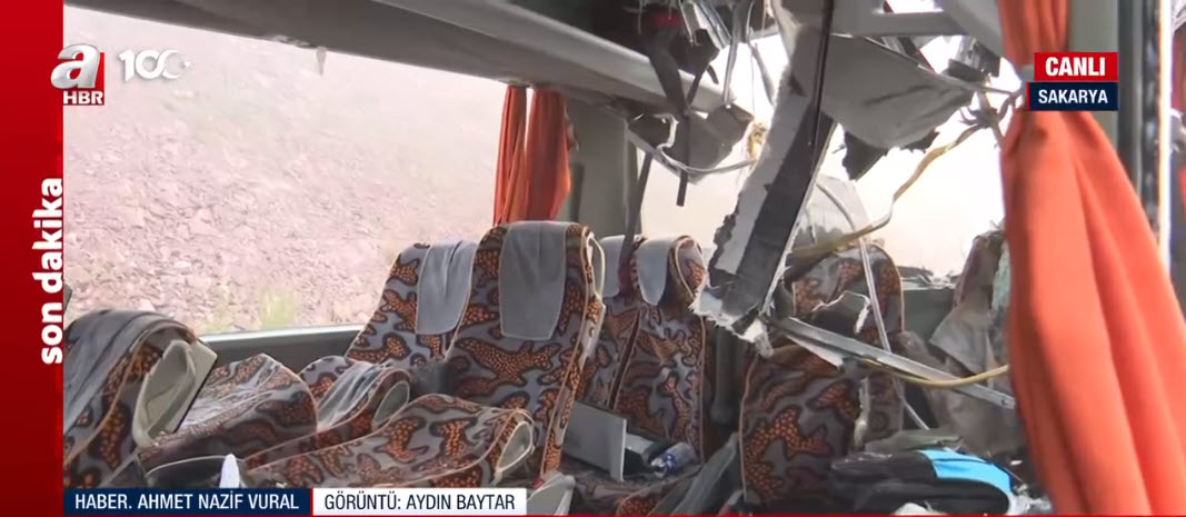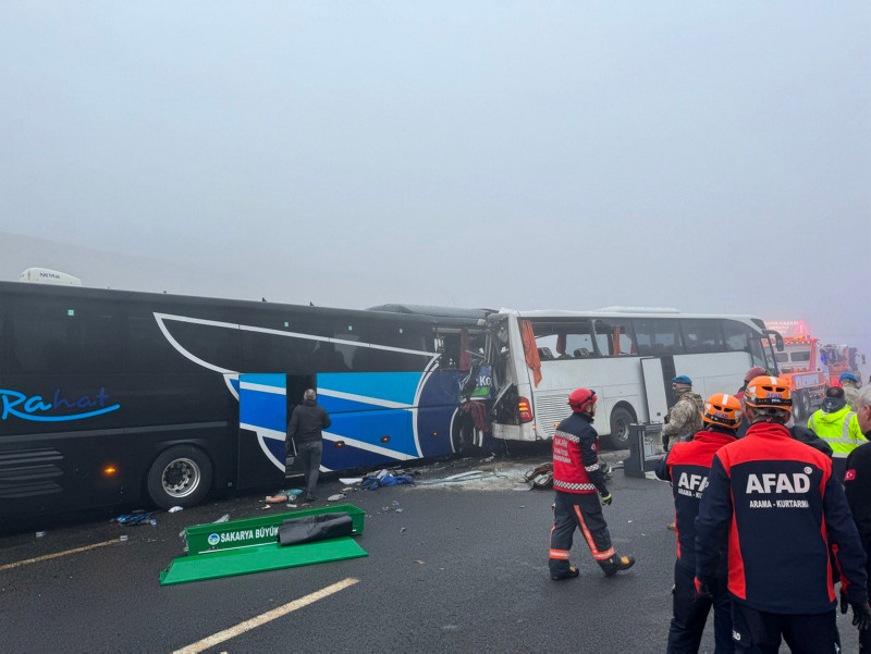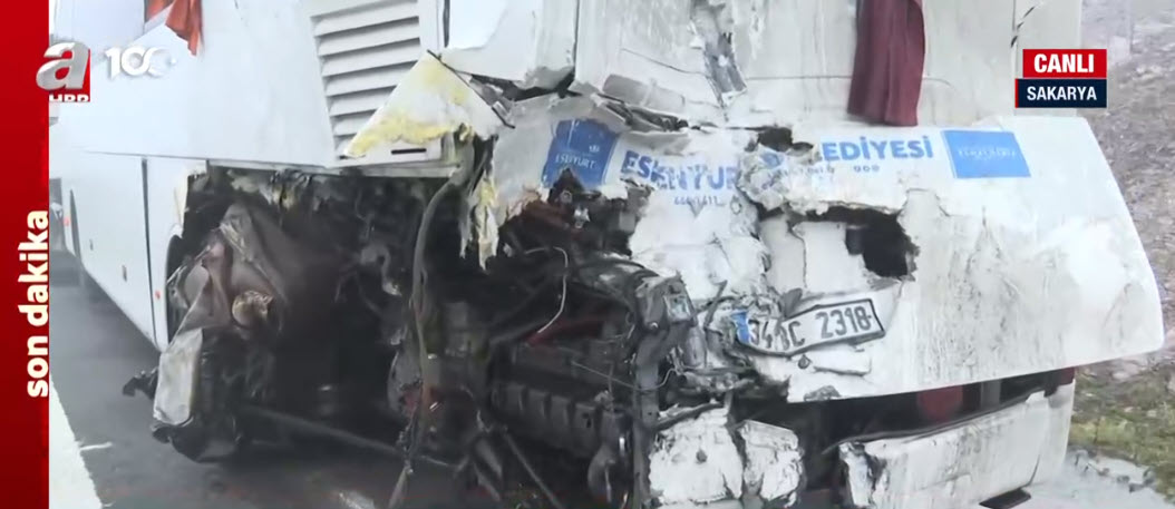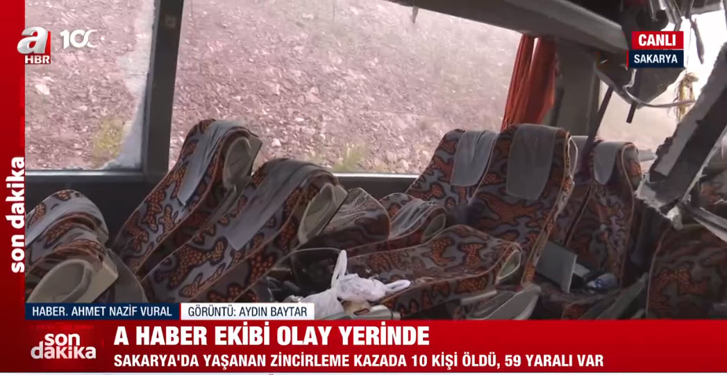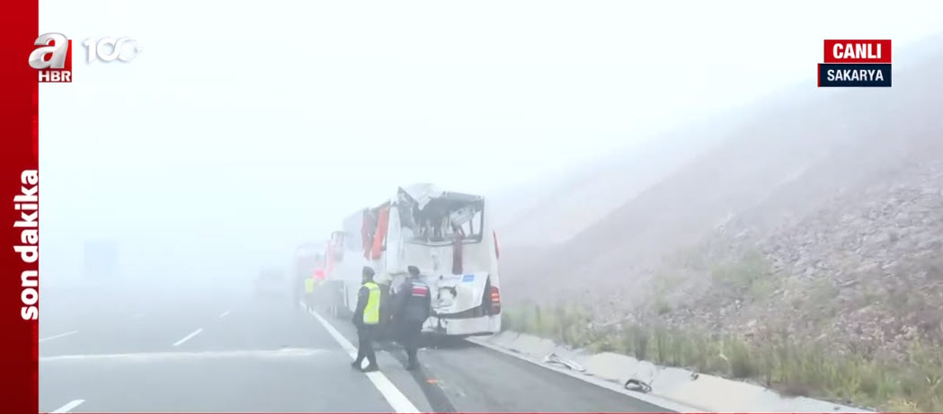 Sakarya'da, Kuzey Marmara Otoyolu'nda, 3'ü yolcu otobüsü, 7 aracın karıştığı zincirleme trafik kazasında 10 kişi öldü, 57 kişi yaralandı. Kaza, saat 04.30 sıralarında Kuzey Marmara Otoyolu'nun Sakarya Dağdibi mevkisinde meydana geldi. İhbar üzerine bölgeye çok sayıda itfaiye, 112 acil sağlık, polis ve jandarma ekibi sevk edildi. Ekiplerin, kazaya müdahalesi sürüyor. A Haber muhabiri Ahmet Nazif Vural, olay yerinden son durumu aktardı. Kazaya karışan Esenyurt Belediyesi'ne ait otobüsün içi görüntülendi.