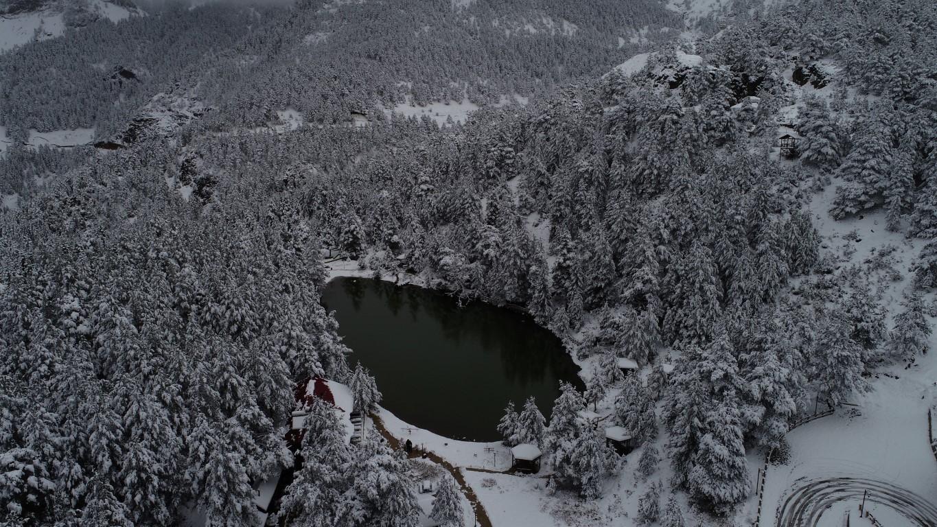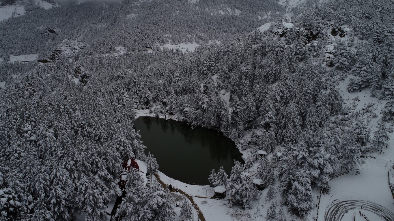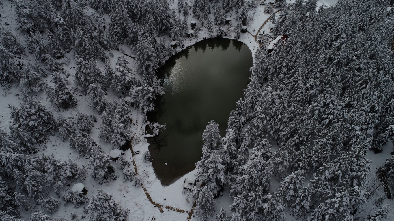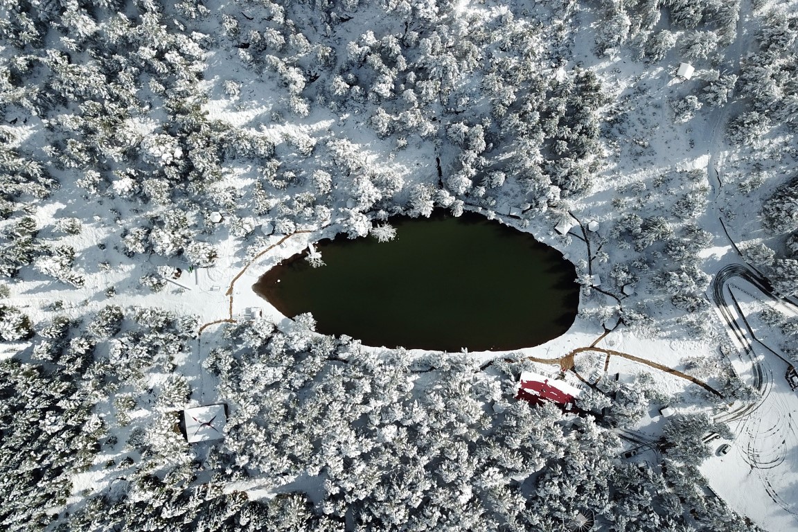 Gümüşhane'nin Torul ilçesine bağlı Zigana köyü sınırlarında bulunan Limni Gölü Tabiat Parkı önceki gün gerçekleşen kar yağışının ardından beyaza büründü. Eşsiz güzelliklerin ortaya çıktığı bölge havadan görüntülendi.