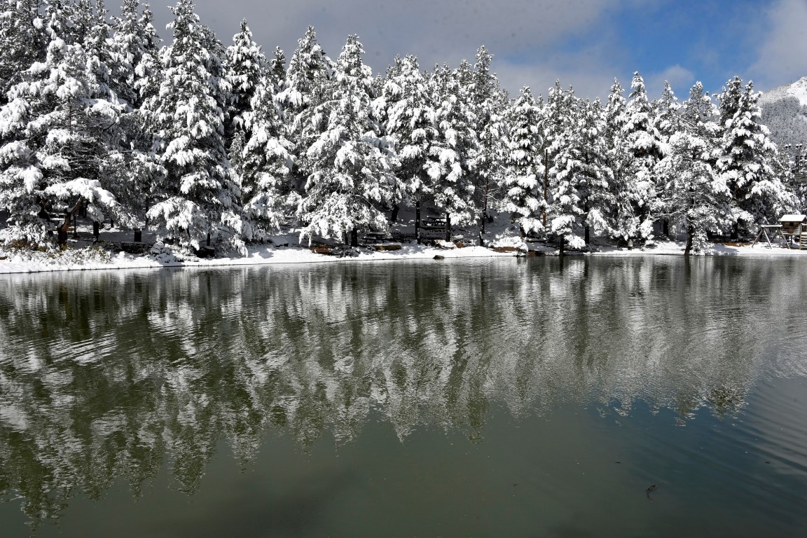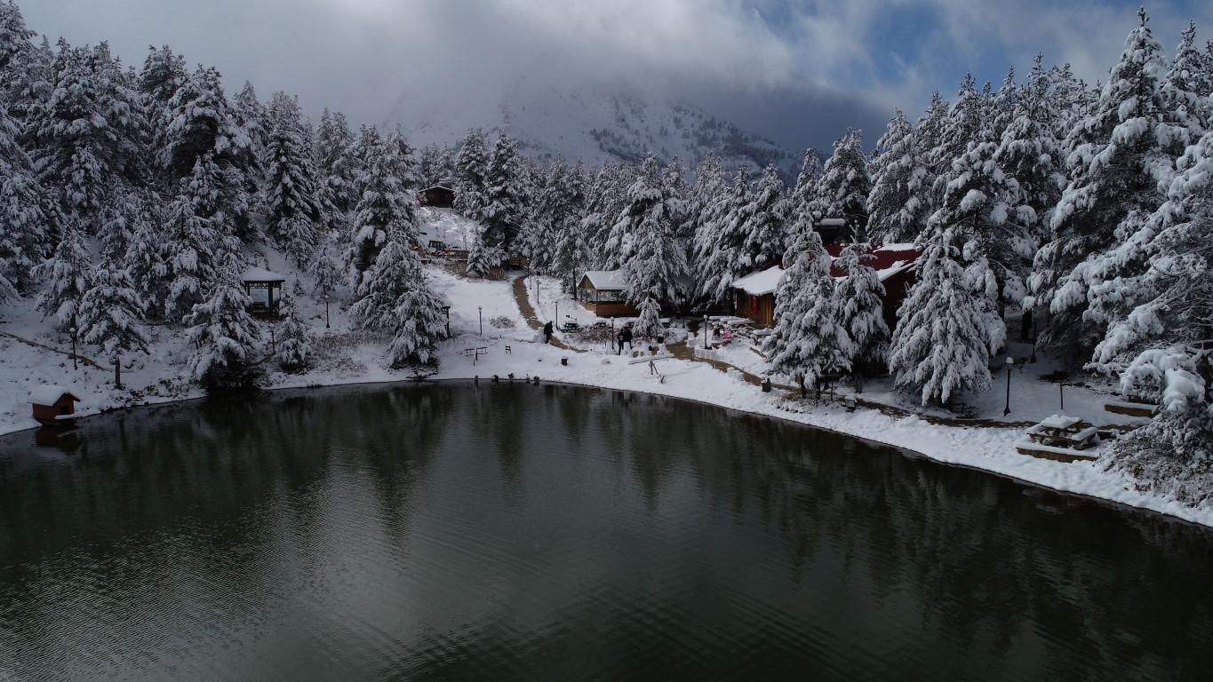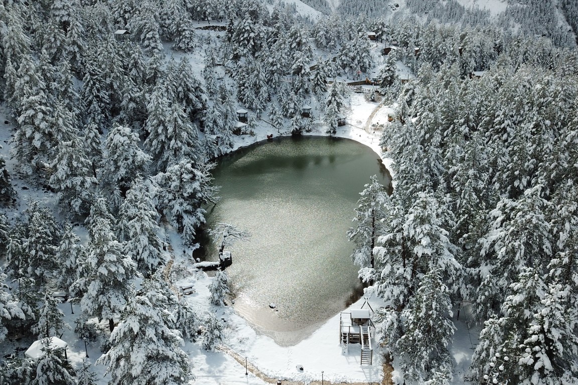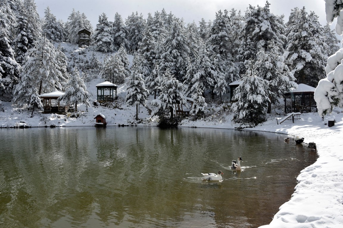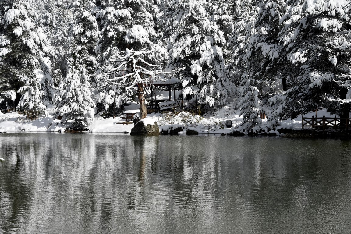 Gümüşhane'nin Torul ilçesine bağlı Zigana köyü sınırlarında yer alan ve denizden 2 bin 24 metre yükseklikte çam ormanları arasında temiz havası, eşsiz doğasıyla 'Huzur veren mekanlarından' birisi olan Limni Gölü Tabiat Parkı, yılın ilk kar yağışıyla birlikte eşsiz güzelliğe büründü.