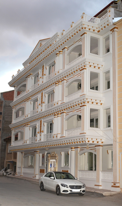 Yapıyla ilgili açıklamalarda bulunan şirket sorumlusu Özgür Şahin, mimaride kullanılan malzemenin çok hassas olduğunu belirterek, malzemelerin yurt dışından getirildiğini söyledi. Şahin, "Dış cephe tamamen bir saray edasında. Tavan ve duvar işlemleri altın yaldızlıdır. Mimaride kapı kolları ve musluklarda 24 ayar altın kaplama kullanılmış olup, mobilyalar altın yaprak ile işlenmiştir. Süslemelerde ise altın yaldız ve kristaller kullanılmıştır. Çelik kapılar özel güvenlikle tasarlanmıştır. Kapılarda parmak okuma sistemi mevcuttur. Özel bir güvenlik sistemi ile korunmaktadır" diye konuştu.
