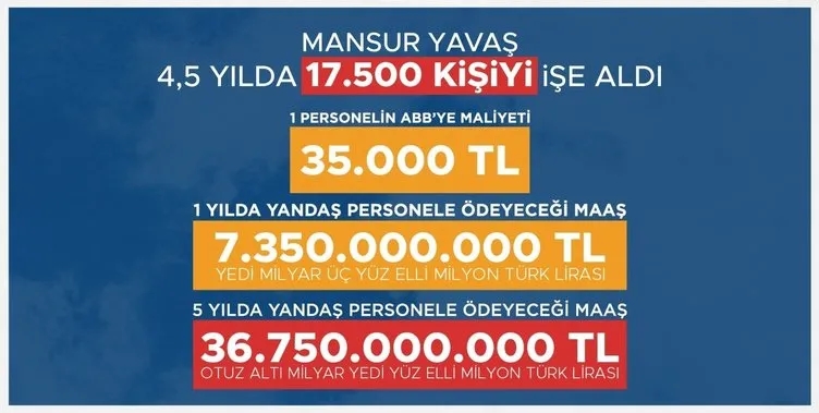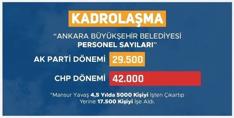 CHP'li Ankara Büyükşehir Belediyesi Başkanı Mansur Yavaş, 31 Mart yerel seçimleri öncesi belediye bünyesinde çalışan hiçbir personeli isten çıkarmayacağına dair namus ve şeref sözü vermesine rağmen mazbatasını alır almaz çeşitli sebeplerle ABB bünyesinde hizmet veren 5 bin kişiyi işinden etti. Bununla da yetinmeyen Yavaş, çıkardığı işçilerin yerine 17 bin 500 kişi alarak Cumhuriyet tarihinin en büyük kadrolaşmasını gerçekleştirdi.
