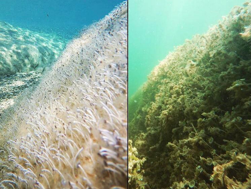 Kuzey Ege'de aynı noktada çekilen 2 fotoğraf ise tehlikeyi gözler önüne seriyor. 2018 yılında çekilen fotoğraftaki "acetabularia" isimli makro alg olan deniz canlısının renkleri ve suyun berraklığı göz dolduruyor. Aynı noktada 2021 yılında çekilen diğer fotoğrafta ise acetabularianın öldüğü ve suyun müsilaj nedeniyle bulanıklaştığı görülüyor.