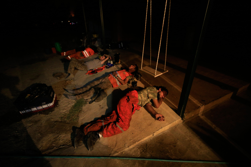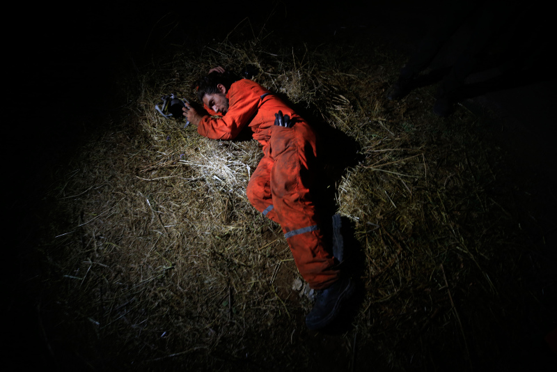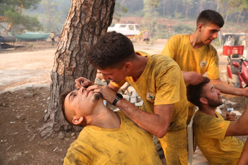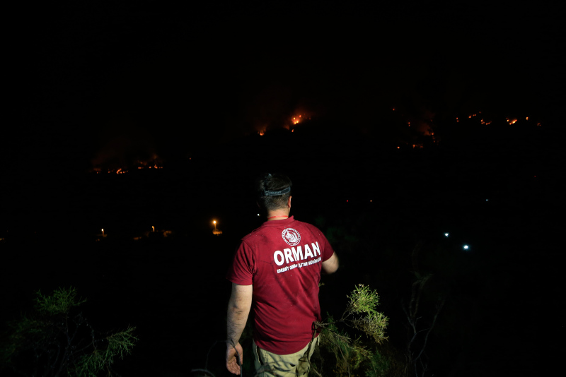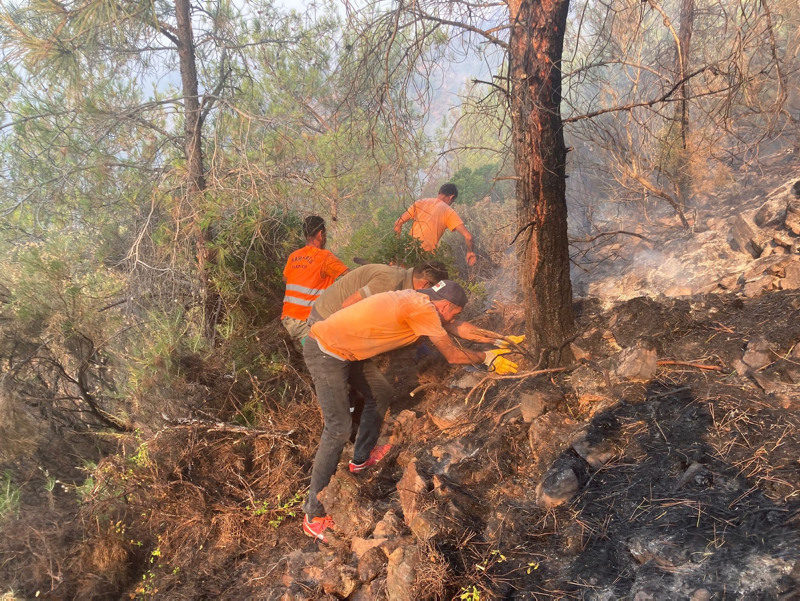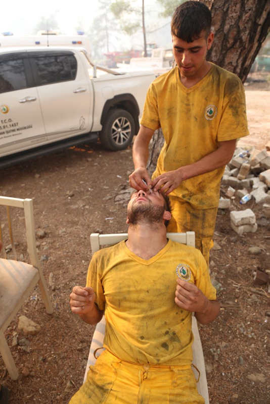 Muğla'nın Marmaris ilçesinde ormanlık alanda çıkan yangına karadan müdahale sürüyor. Yangına dün akşamdan beri durmadan, özverili bir şekilde müdahaleye katılan hem gönüllüler hem de orman işçileri, fırsat buldukça dinleniyor. Yerde ve toprak zeminde yatıp dinlendikten sonra söndürme çalışmalarına devam ediyorlar.