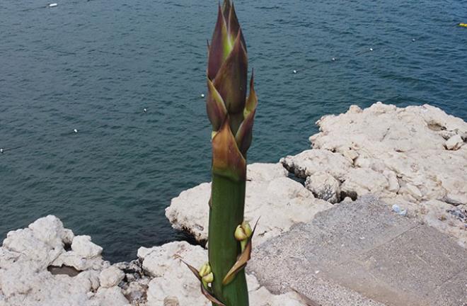 Denizin 3 metre üzerinde kayalık bölgede biranda boy atarak 4,5 metreye ulaşan çiçeği görenler ise şaşırdı.