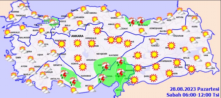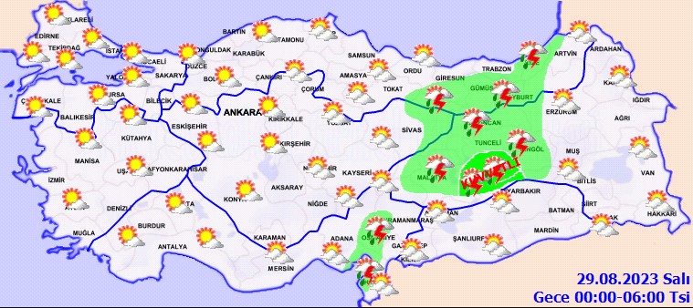 Meteoroloji Genel Müdürlüğü tarafından yapılan son değerlendirmelere göre, Akdeniz ve Doğu Karadeniz ile Kocaeli, Sakarya, Konya, Kayseri, Nevşehir, Niğde, Sivas, Tokat, Ordu, Malatya, Erzincan, Tunceli, Elazığ, Bingöl, Gaziantep ve Kilis çevrelerinin yerel sağanak ve gök gürültülü sağanak yağışlı geçeceği tahmin ediliyor. Yağışların Adana, Hatay, Osmaniye, Kahramanmaraş'ın batısı, Kayseri'nin güney ve doğusu ile Sivas'ın güneybatısı ve Elazığ çevrelerinde yerel olarak kuvvetli olacağı tahmin ediliyor.