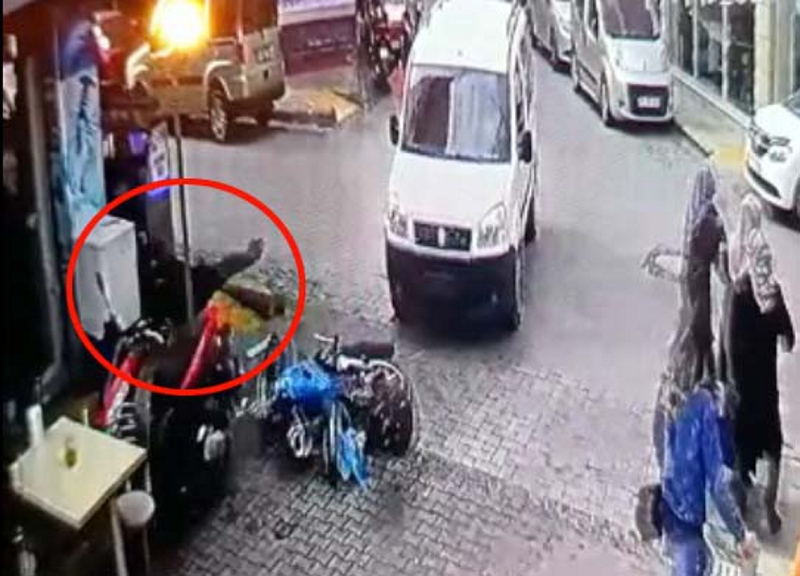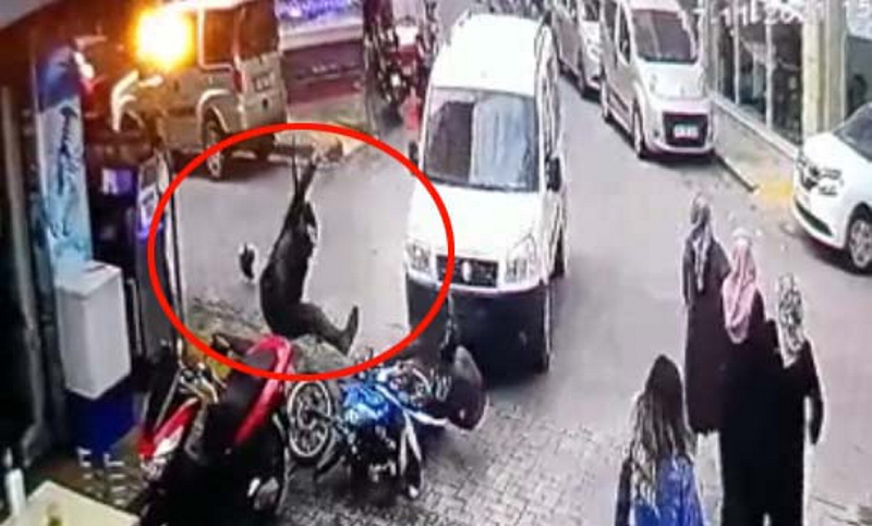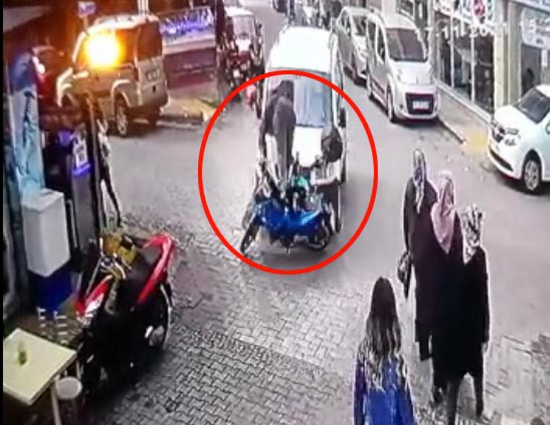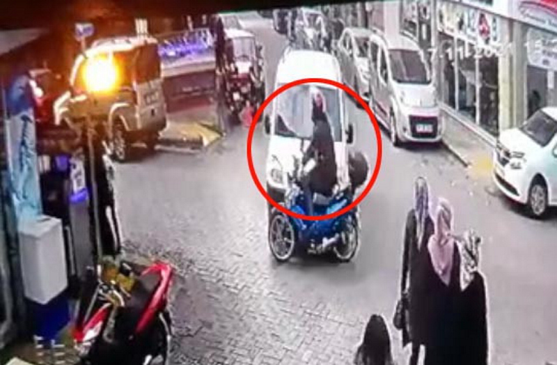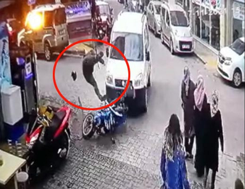 Bu arada kaza, bir iş yerinin güvenlik kamerasına yansıdı. Görüntülerde, hafif ticari araçla çarpışan motosikletin sürücüsünün savrulup bir iş yerinin duvarına çarptığı görüldü.