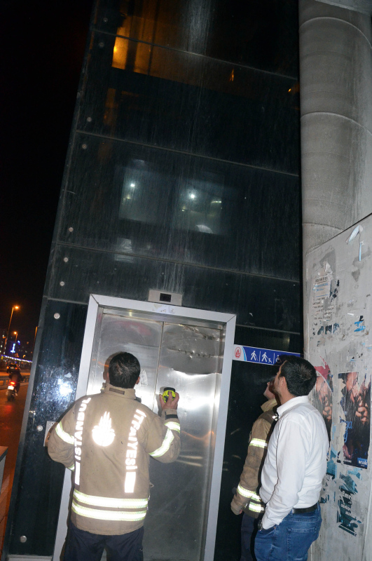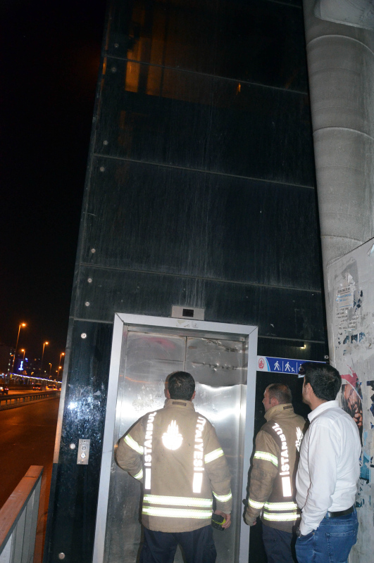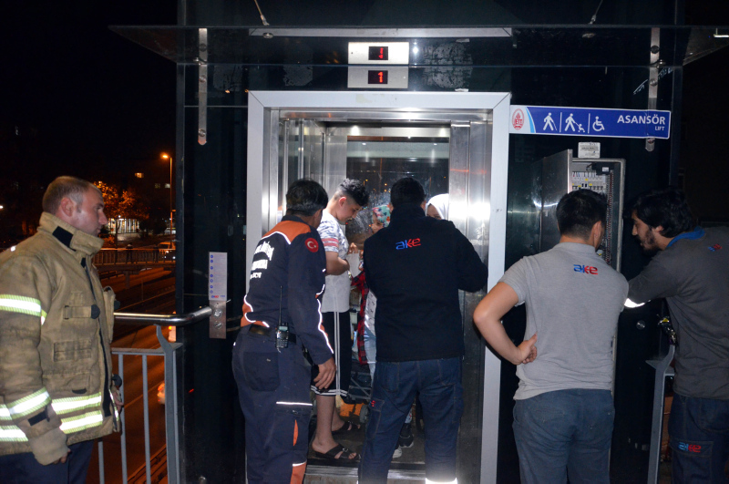 Şükrübey Durağı'ndaki asansör dün saat 21.30 sıralarında aşağı inerken aniden durdu. Cam kabininde 2'si bebek 3 kişinin bulunduğu asansörü asılı halde görenler İstanbul Büyükşehir Belediyesi ve itfaiyeyi aradı. Bu sırada bir anne ile kızı, 2 metre yukarıda asılı kalan cam kabinli asansördekilere el sallayarak moral vermeye çalıştı. Genç kız bir ara cep telefonununu uzatarak, büyük harflerle yazdığı "Bekleyin" yazısını da gösterdi.
