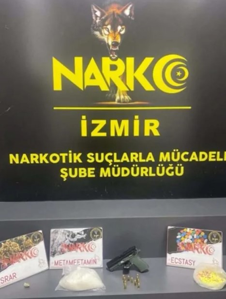 Kemalpaşa ilçesinde polis ekiplerince durdurulan yarış motosikleti ve araçta arama yapan polis ekipleri tarafından, 550 gram metamfetamin, 750 adet ecstasy, 1 tabanca ve 11 fişek ele geçirildi.