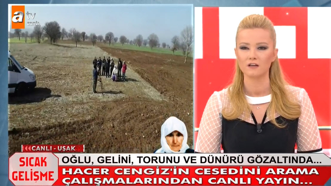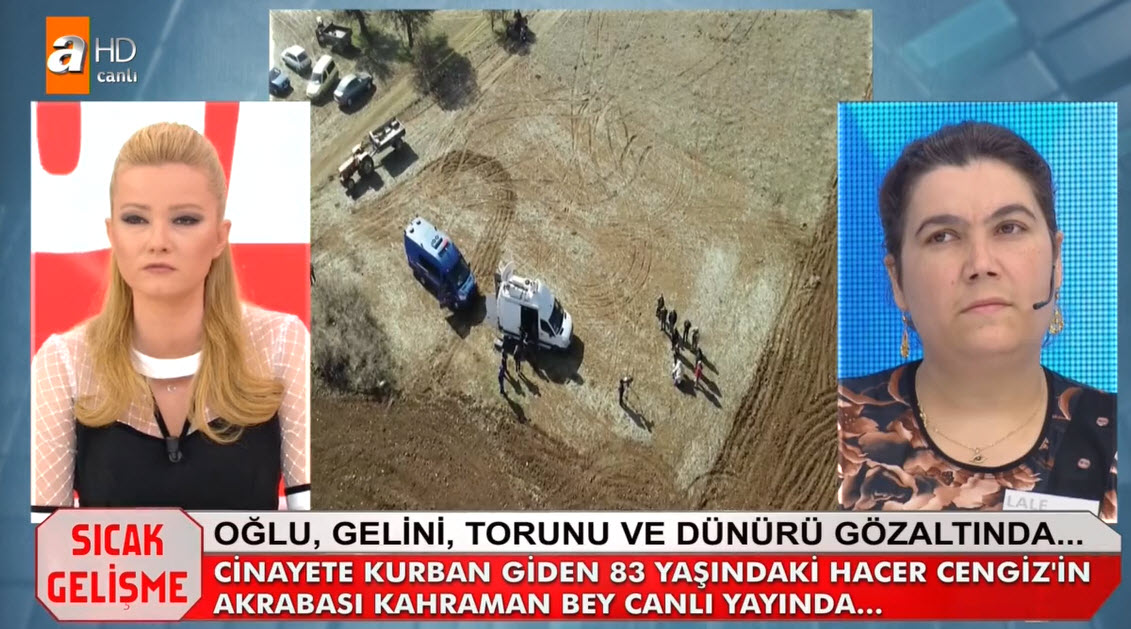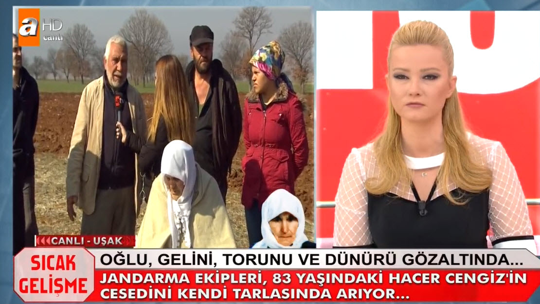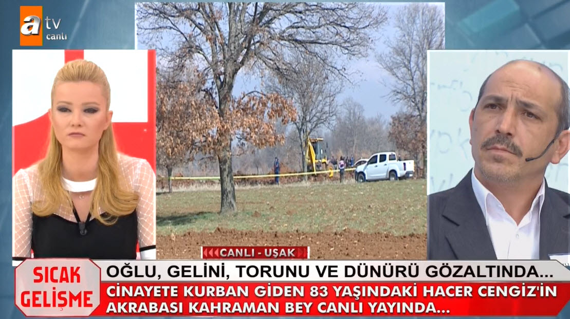 Müge Anlı canlı yayınında Hacer Cengiz'in katil zanlıları aranıyordu. Hacer Cengiz'in katili kim? Müge Anlı 6 yıl önce işlediği cinayet olayını yeniden gündemine aldı. Uşak'taki gelişmeler sonrası 83 yaşındaki Hacer Cengiz'in katil zanlısı olaran torunu, oğlu, gelini ve dünürü gözaltına alındı. Müge Anlı Uşak'tan canlı yayın yaparken, Hacer Cengiz'in bazı akrabaları torundan şüphelendiklerini belirtti. İşte Müge Anlı canlı yayınında yaşananlar... HACER CENGİZ'İN CANSIZ BEDENİ TARLASINDA ARANDI - İZLEMEK İÇİN TIKLAYIN CANLI YAYININDA İTİRAF HACER CENGİZ'İN KATİLİ BELLİ OLDU - İZLEMEK İÇİN TIKLAYIN