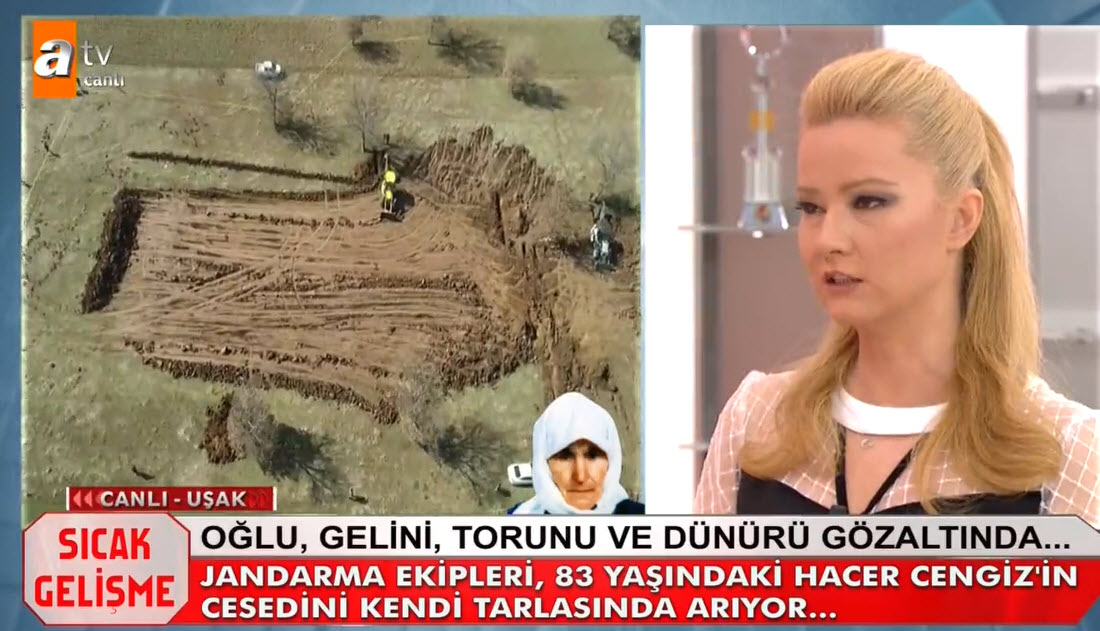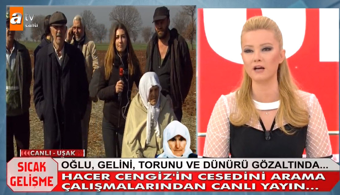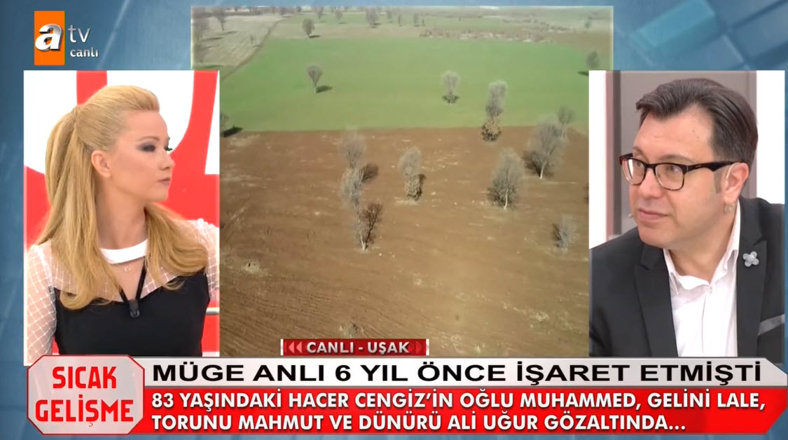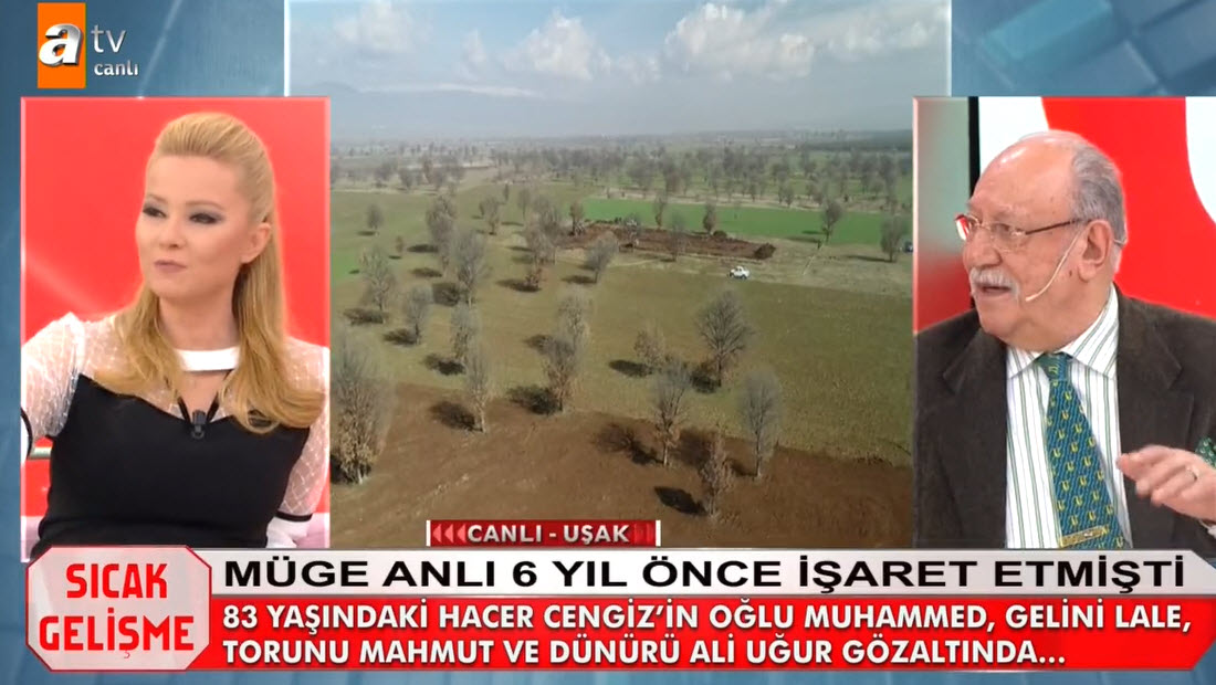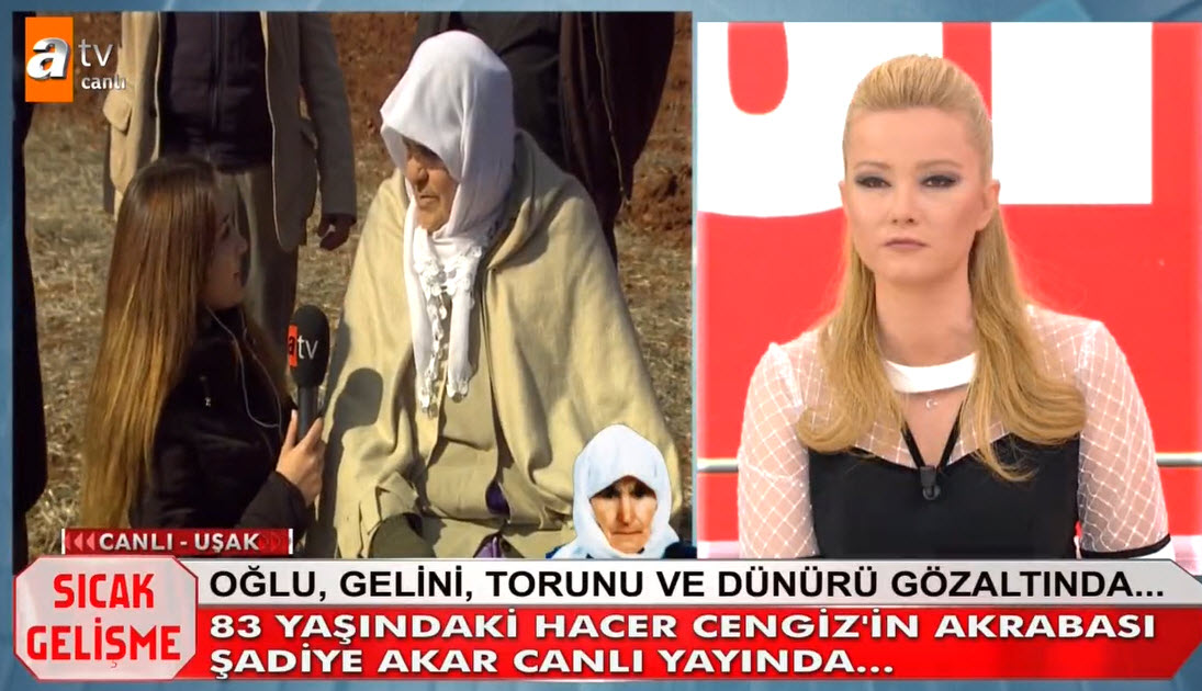 Müge Anlı canlı yayınında Hacer Cengiz'in katil zanlıları aranıyordu. Hacer Cengiz'in katili kim? Müge Anlı 6 yıl önce işlediği cinayet olayını yeniden gündemine aldı. Uşak'taki gelişmeler sonrası 83 yaşındaki Hacer Cengiz'in katil zanlısı olaran torunu, oğlu, gelini ve dünürü gözaltına alındı. Müge Anlı Uşak'tan canlı yayın yaparken, Hacer Cengiz'in bazı akrabaları torundan şüphelendiklerini belirtti. İşte Müge Anlı canlı yayınında yaşananlar... HACER CENGİZ'İN CANSIZ BEDENİ TARLASINDA ARANDI - İZLEMEK İÇİN TIKLAYIN CANLI YAYININDA İTİRAF HACER CENGİZ'İN KATİLİ BELLİ OLDU - İZLEMEK İÇİN TIKLAYIN