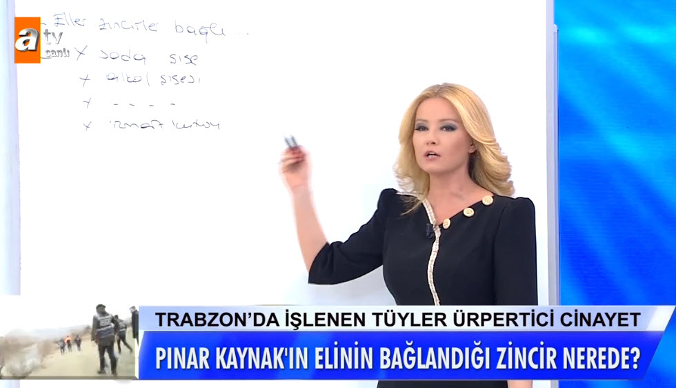 Müge Anlı Pınar Kaynak davasının dosyasını canlı yayında okudu. Müge Anlı son dakika gelişmesiyle şaşkına döndü. Trabzon'da vahşice öldürülen Pınar Kaynak'ın davasında hakim karşısına çıkan Nuri ve Arın için istenen tutuklanma talebi reddedilmişti. Müge Anlı başka bir konuya dikkat çekerek dosyada eksikliğin olduğunu belirtti. ATV'nin ünlü sunucusu Pınar Kaynak'ın ölü bulunduğu olay yeri hakkında hazırlanan raporu canlı yayında okudu. İşte Pınar Kaynak hakkında Müge Anlı'daki son dakika detayı.