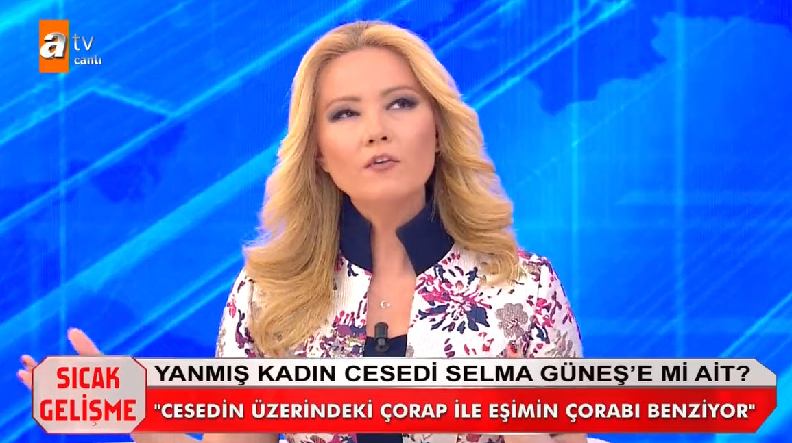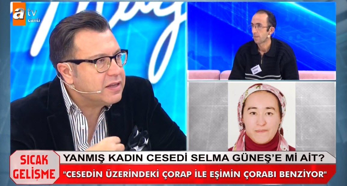 Müge Anlı'ya eşi Selma Güneş'in kaybolduğu gerekçesiyle başvuran Mahmut Güneş, İzmir'de bulunan yanmış kadın cesedinin eşi olabileceğini belirtti. Eşi Selma Güneş'in çoraplarının, yanmış kadın cesedindeki çoraplara benzediğini söyleyen Mahmut Güneş, Müge Anlı'ya "Kendisi mi gitti, yoksa öldü mü bilmiyorum" dedi. Müge Anlı ile Tatlı Sert'in 12 Aralık programında Selma Güneş hakkında başka bir iddia da gündeme geldi.