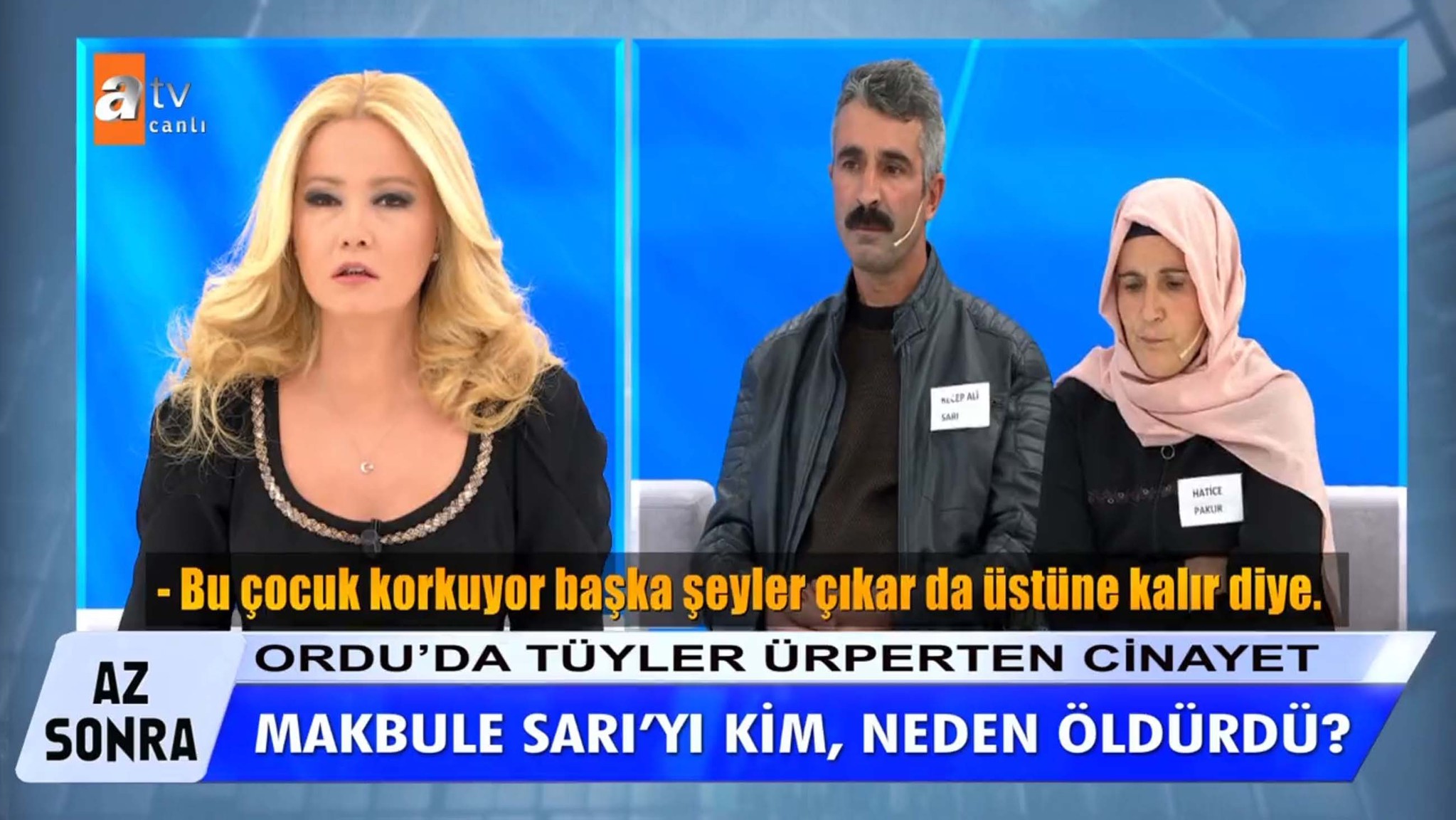 Ordu'nun Korgan ilçesinde tek başına yaşayan Makbule Sarı, çocukları tarafından domuz bağı ile bağlanıp çarşafa sarılmış halde ölü olarak bulunmuştu. 74 yaşındaki kadının çocukları annelerinin katilini bulmak için Müge Anlı ve ekibinden yardım istemişti. Korkunç şekilde öldürülen ve altın dişleri dahil evdeki tüm değerli eşyaları çalınan Sarı'nın ölümüyle ilgili 2 kişi gözaltına alındı. Müge Anlı'daki Makbule Sarı cinayetinde beklenen itiraf geldi.