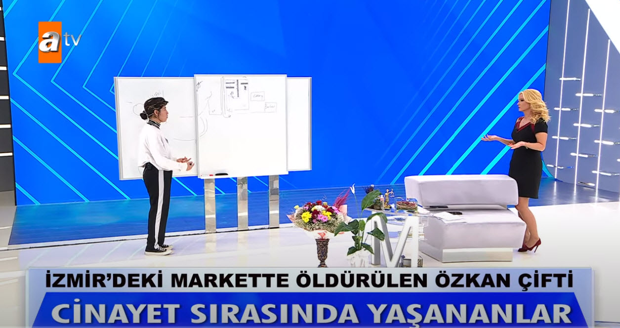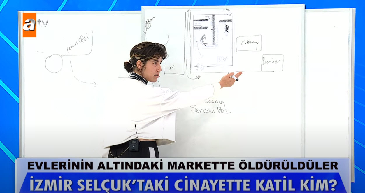 İzmir'de işlenen Özkan Çifti cinayetinde kızları Begüm Özkan, cinayeti kroki üzerinden anlattı. Olay yerinin krokisini tahtaya yapıştıran Begüm Özkan, saat gece 02:00'de işlenen cinayetin tanıdık bir kişi tarafından işlendiğini anlattı.