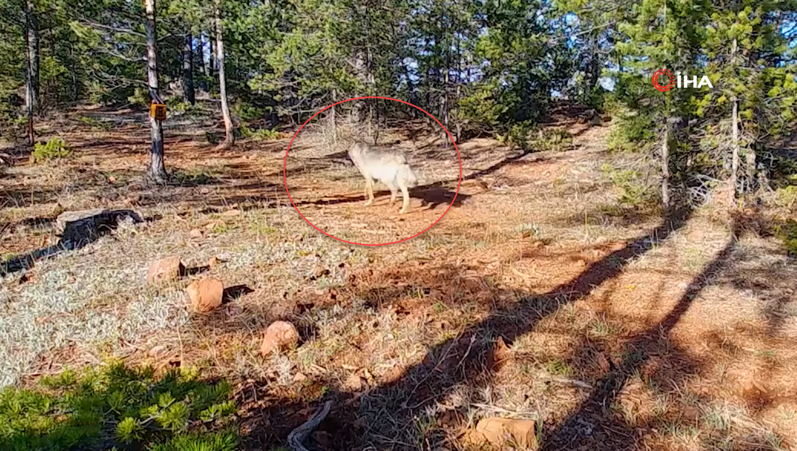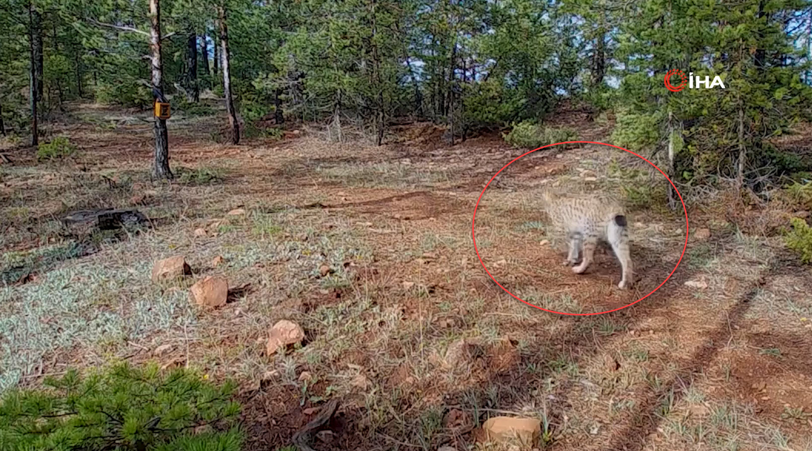 Gece avlandığı gündüz de dinlendiği için nadir görülen ve "ormanın hayaleti" olarak adlandırılan Kafkas vaşağının, sarıçam ormanlarında karla kaplı arazide avlanması anbean görüntülendi.