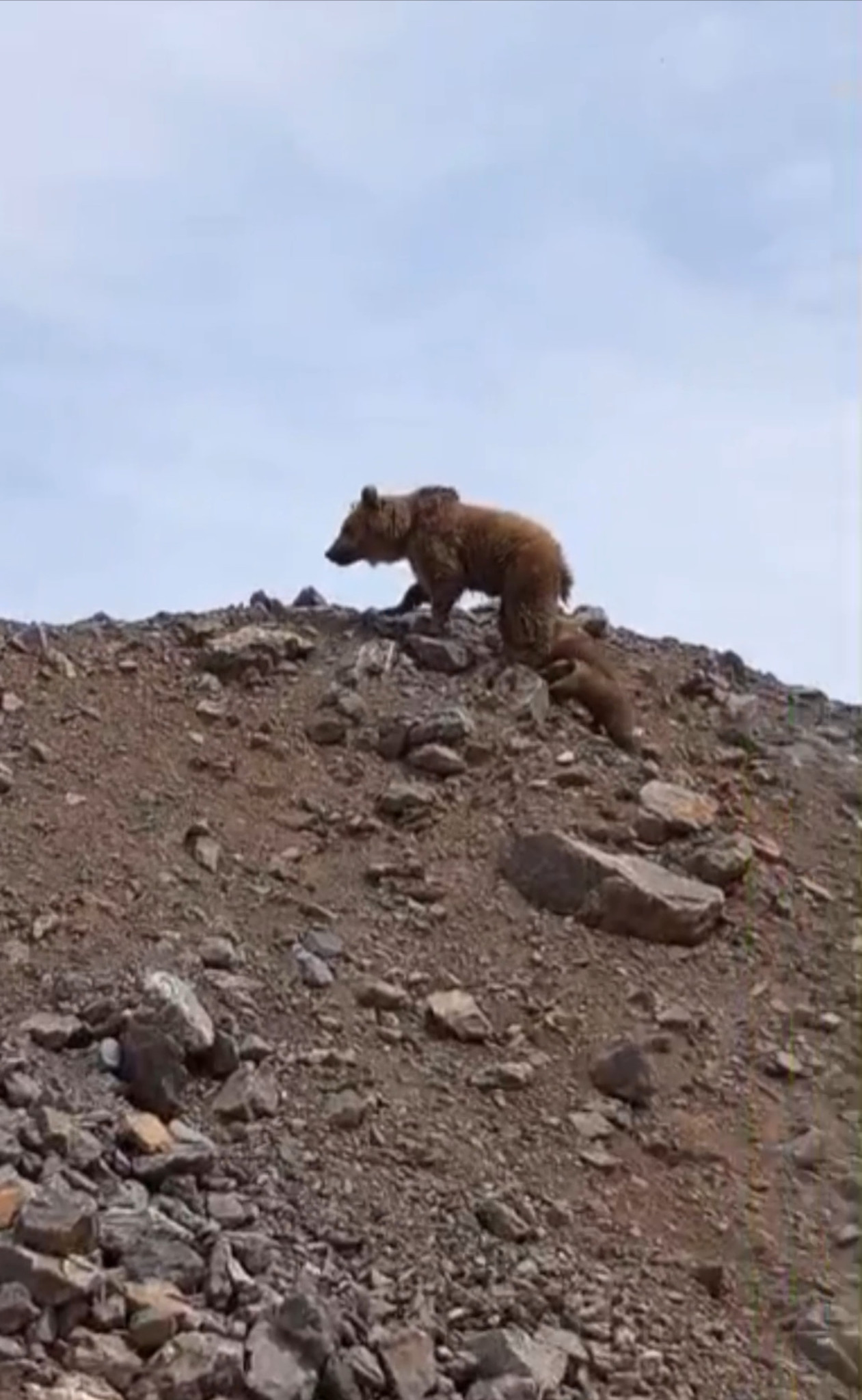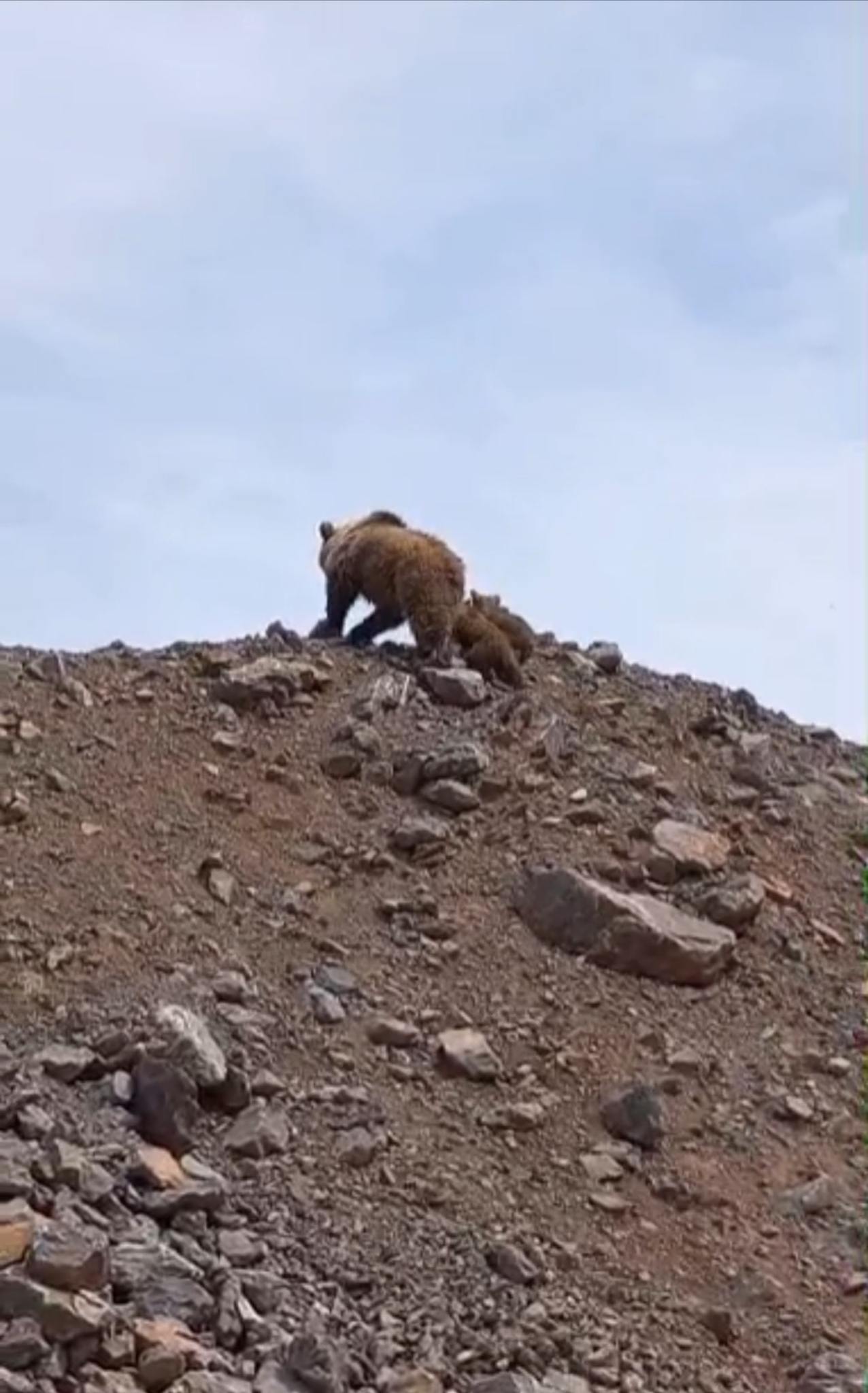 Kış uykusundan yeni uyanmış anne ayı ve iki yavrusu, dağ yamacında yiyecek aradıktan bir süre sonra gözden kayboldu.