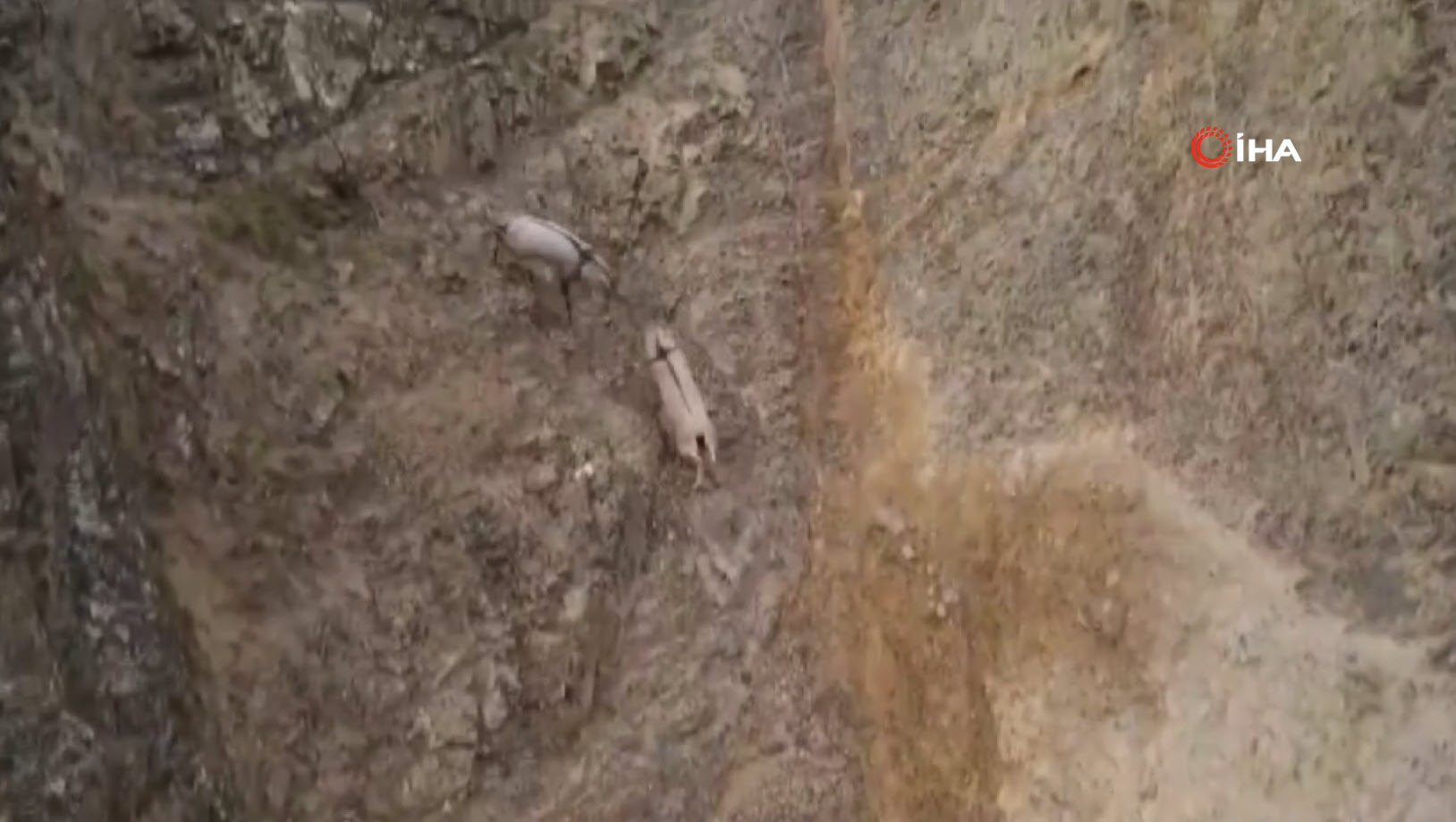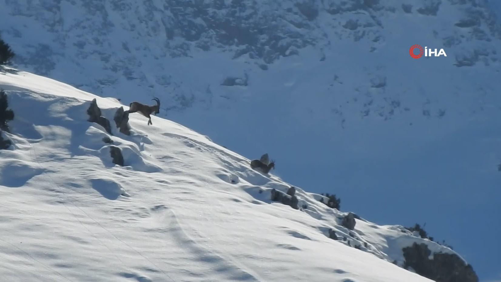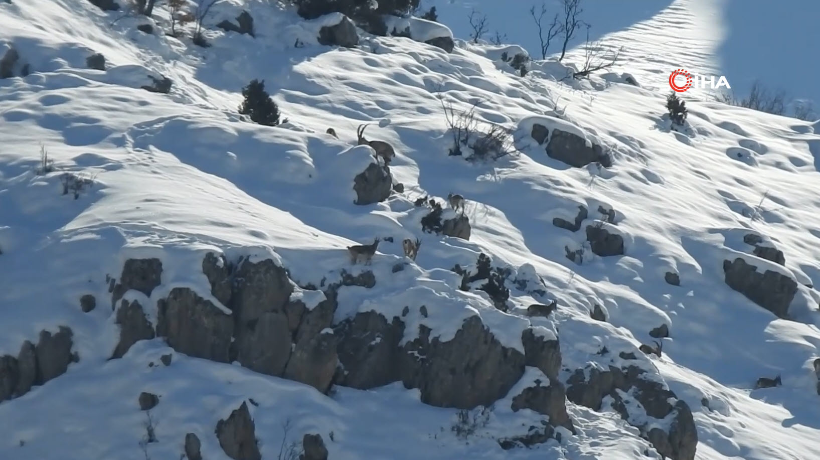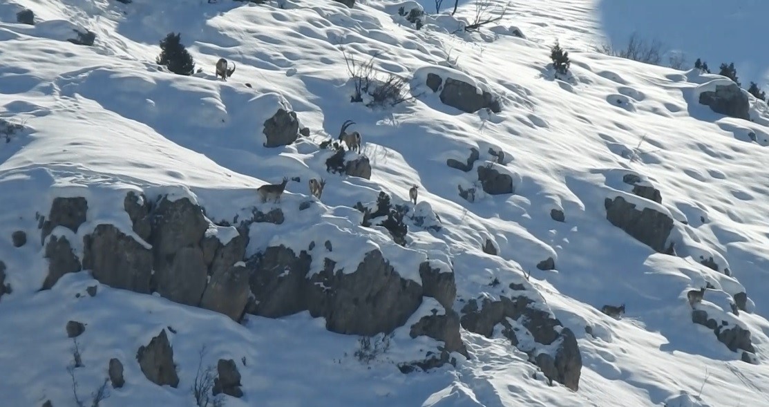 Doğa Koruma Birliği'nin (IUCN) yayımladığı Nesli Tükenme Tehlikesi Altında Olan Türlerin Kırmızı Listesi'nde bulunan, avlanması yasak ve koruma altındaki tür olan yaban keçileri, karlı arazide bata çıka ilerleyerek yollarına devam etti.