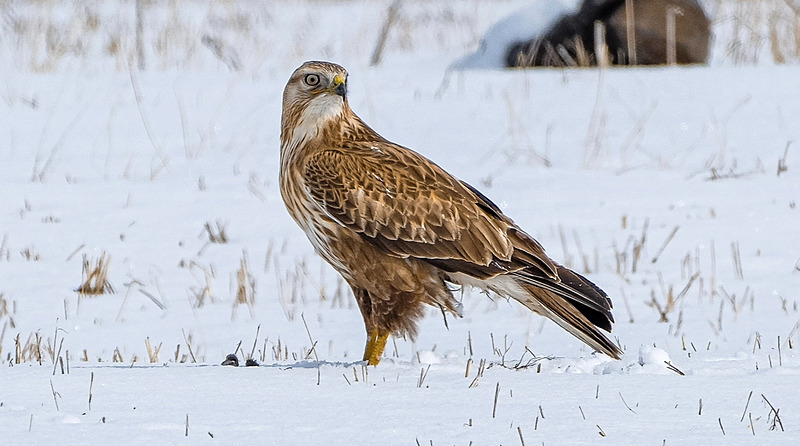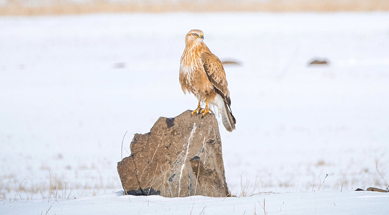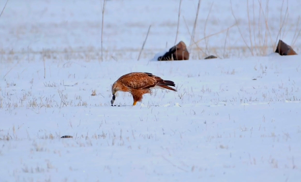 Yılan, kertenkele, kör fare hatta tavşan gibi türleri de avlayarak hayatını idame ettirmeye çalışan kızıl şahinler, karla kaplı arazide avlanırken görüntülendi.