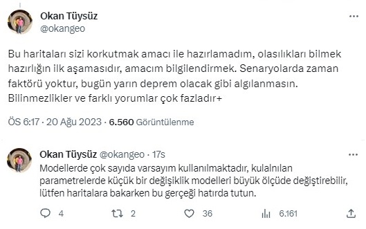 Marmara'da olması beklenen depremin, İstanbul'a etkisini 4 senaryo ile paylaşan Tüysüz, "Bu haritaları sizi korkutmak amacı ile hazırlamadım, olasılıkları bilmek hazırlığın ilk aşamasıdır, amacım bilgilendirmek. Senaryolarda zaman faktörü yoktur, bugün yarın deprem olacak gibi algılanmasın. Bilinmezlikler ve farklı yorumlar çok fazladır." açıklamasında bulundu.