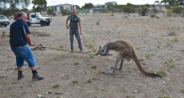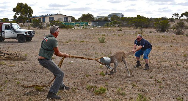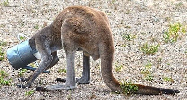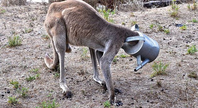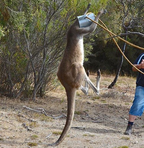 Kanguru başını sulama tenekesine sıkıştırınca olanlar oldu. Avustralya'nın güneyinde yer alan Coffin Körfezi'nde Cumartesi günü meydana gelen olayda başını tenekeye sıkıştıran kanguruyu kurtarmak için Rob Smith ve Steve Dew akıllara durgunlu veren bir yöntemle tenekeyi çıkartmaya çalıştı...