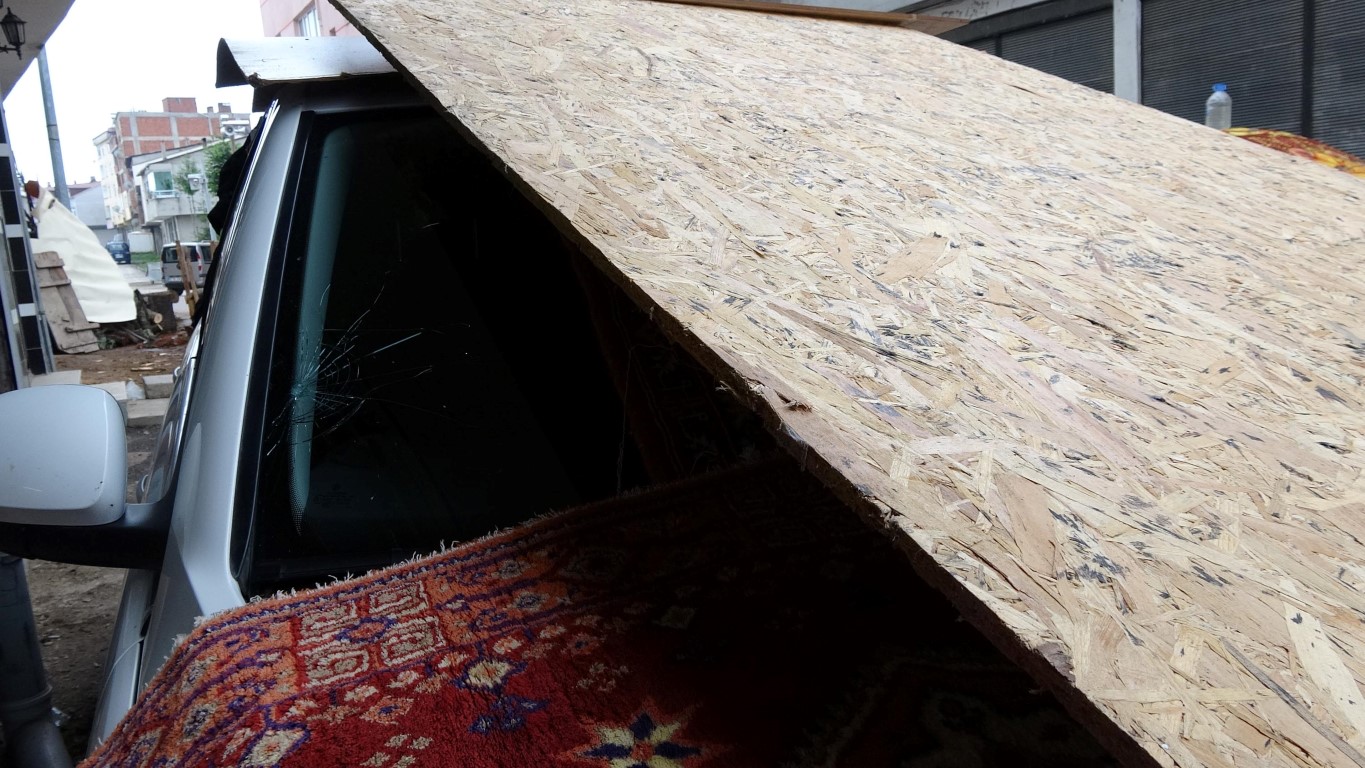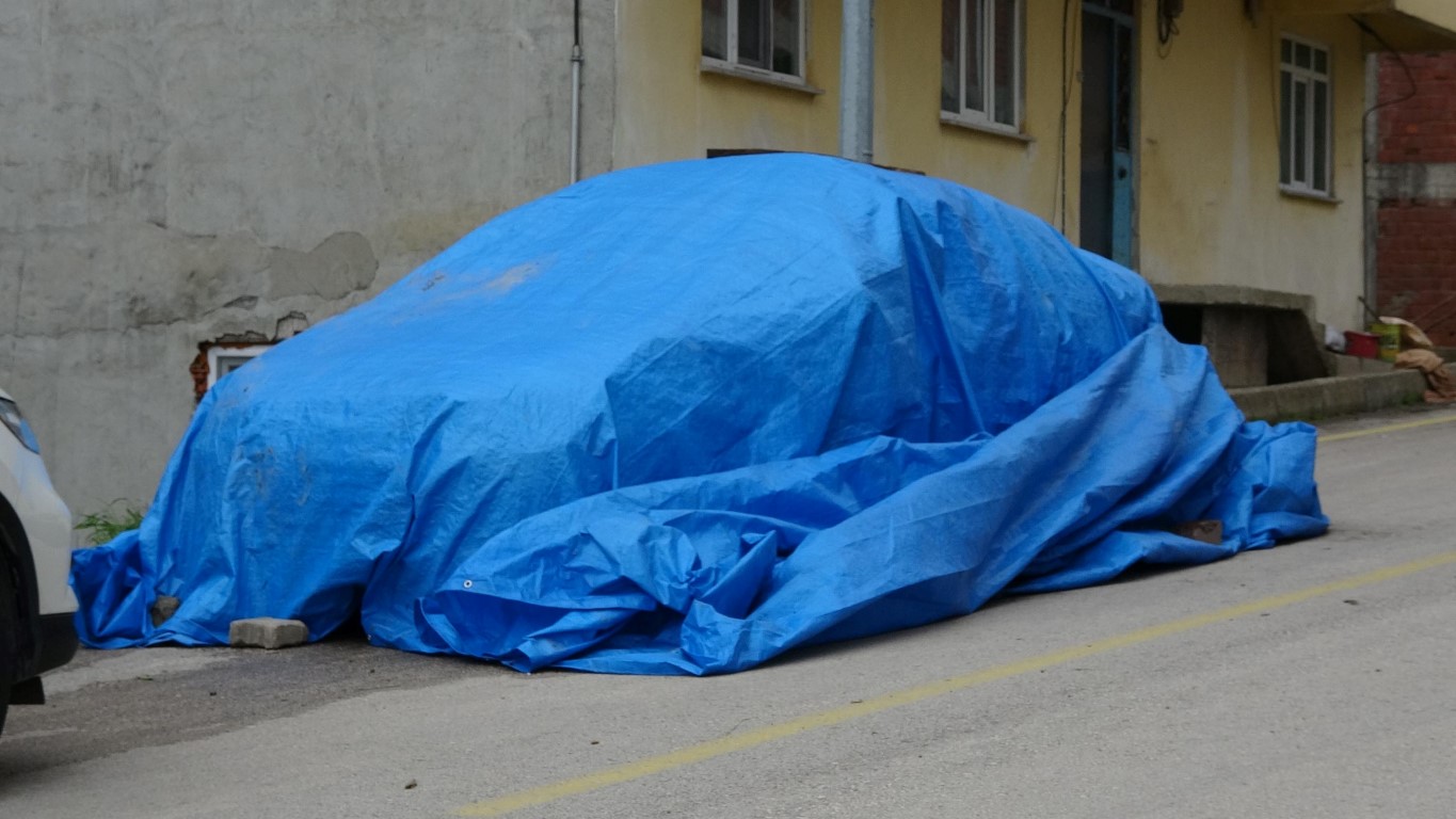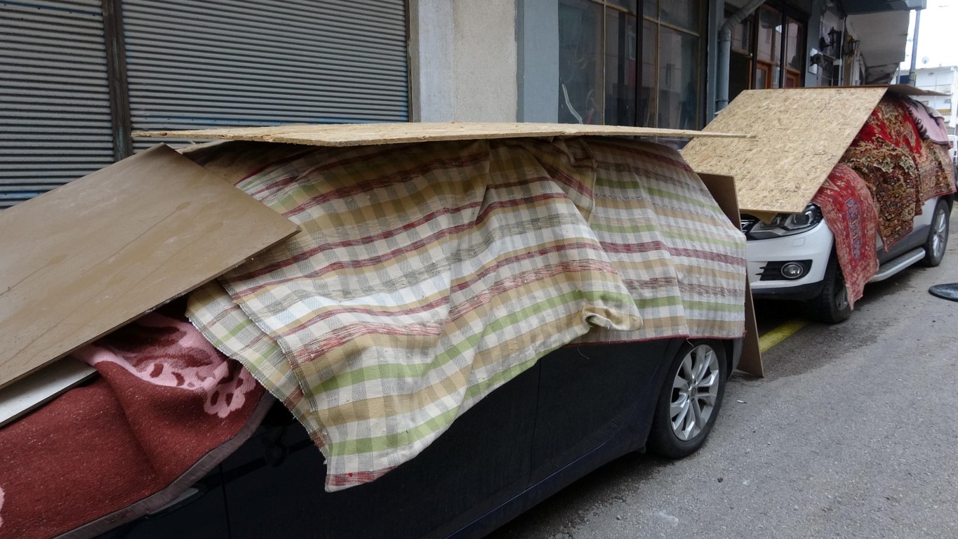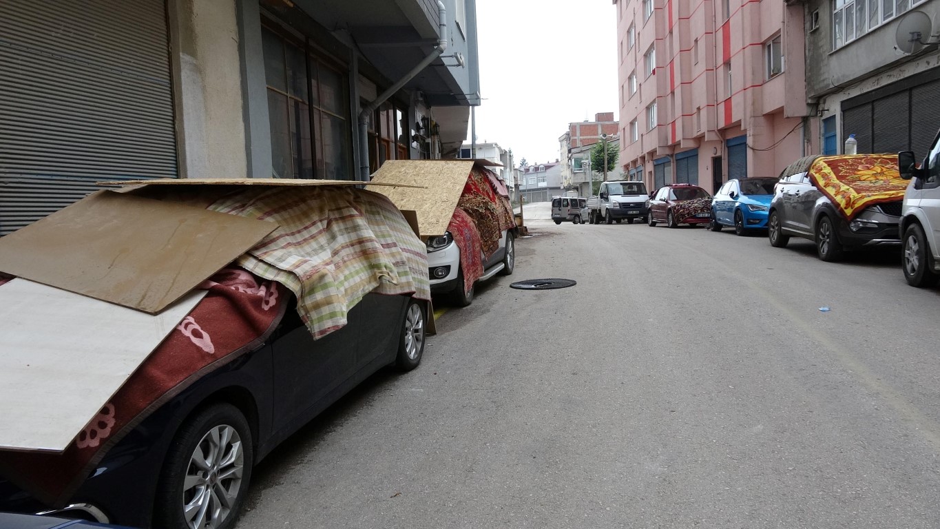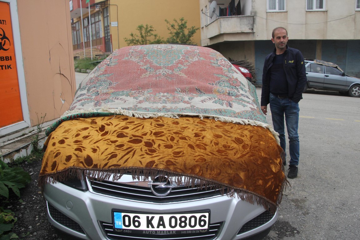 Ordu'da 9 kişinin yaralanmasına neden olan dolu afetinin ardından, vatandaşlar araçlarını korumak için battaniye ve kontroplak tahtalarla tedbir aldı.