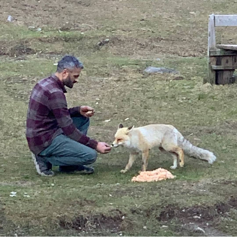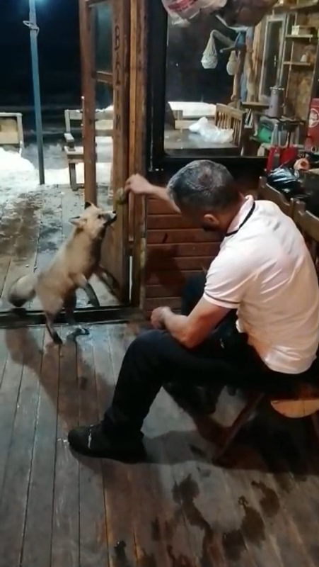Çamlıhemşin ilçesi Ayder Yaylası Galer Düzü mevkisinde kafe işleten Osmanoğlu, aç kalıp zaman zaman iş yerine gelen iki tilkiyi beslemeye başladı.