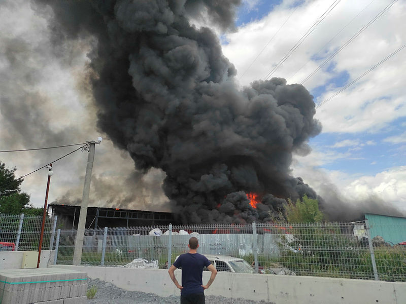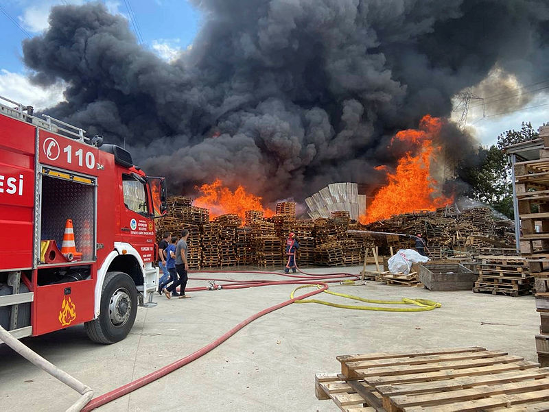 Sakarya'nın Arifiye ilçesinde plastik geri dönüşüm fabrikasında çıkan ve palet üretim tesisine sıçrayan yangın, itfaiyenin müdahalesiyle söndürülmeye çalışılıyor.