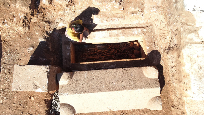 Ahşap, çini, mermer, taş gibi farklı malzemelerden yapılan sanduka mezarda, 1800 yıllık olduğu değerlendirilen 4 insan iskeleti tespit edildi.