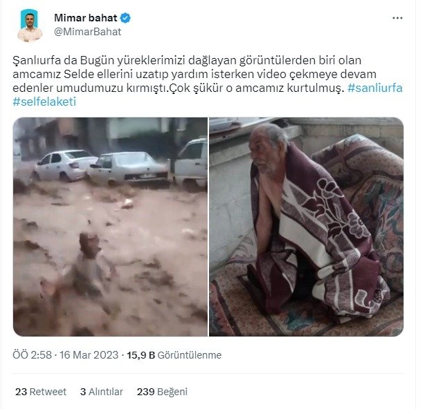 Şanlıurfa'da sele kapılan bir Reşat Ayva, ara sokakta akıntı tarafından sürüklenirken vatandaşların kamera çekimine yakalandı. Bu çekim esnasında görüntüyü çeken vatandaşa selde sürüklenen Reşat Ayva'nın elini uzattığı görüldü. Sele kapılan Ayva'nın bu görüntüsü ise tüm Türkiye'nin yüreğini dağladı. Selin simgesi olan selzede Ayva'dan ise güzel haber geldi. Selde sürüklenen Reşat amcanın Şanlıurfa'daki Zeytinlik Otoparkı'nın önüne vardığında otoparkçılar ve vatandaşlar tarafından kurtarıldığı ortaya çıktı.