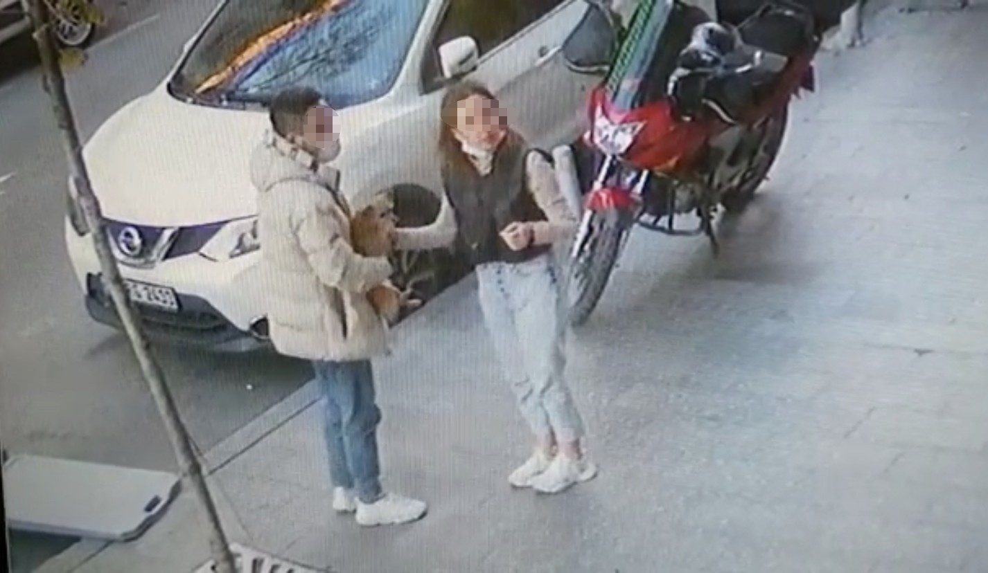 Bir müddet sonra kapalı kasa bir minibüsten inen genç çift, yürüyerek işyerinin önüne geldi. Buradaki sevimli köpeği gören genç kız, köpeği kucağına alıp sevmeye başladı.