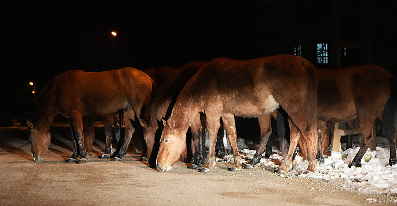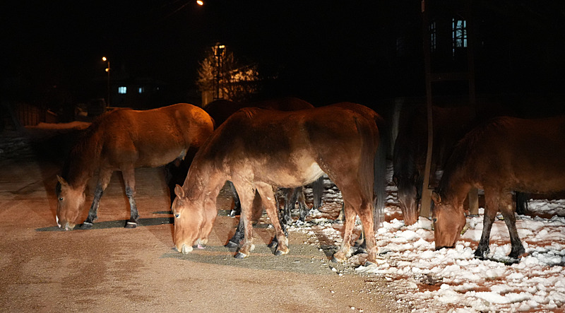 Bolu'da akşam saatlerinde görenleri hayrete düşüren anlar kayda geçti. Boş arsada silaj paketlerini yiyen yılkı atları görüntülendi. Ekipler harekete geçti.