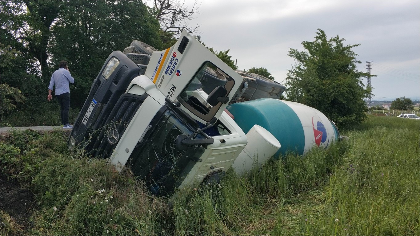 Seyir halindeki beton mikseri yol çökünce şarampole devrildi