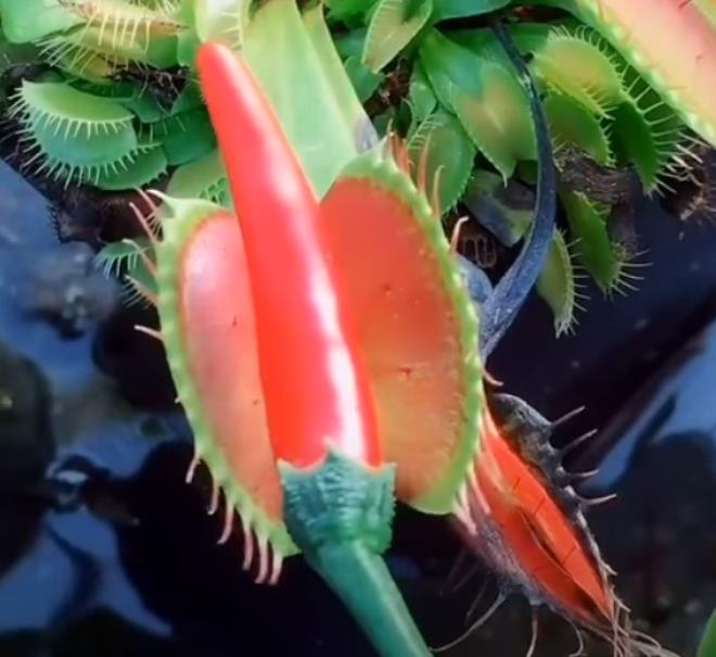 Sinek kapan bitkisine acı biber yedirilirse... Halk arasında sinek kapan olarak bilinen et yiyen bitki üzerinde yapılan ilginç deneyin sonucu görenleri hayrete düşürdü. Acı biber yedirilen sinek kapan bitkisinin hazin sonu şaşırttı.