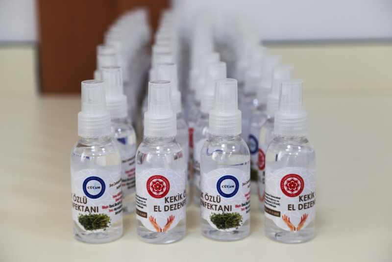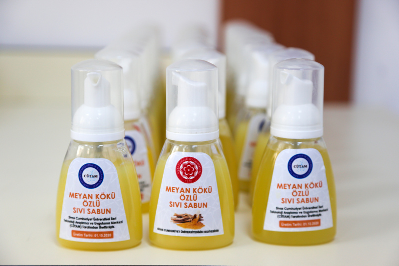 Sivas Cumhuriyet Üniversitesi İleri Teknoloji Araştırma ve Uygulama Merkezi (CÜTAM) Sivas yöresine ait endemik bitkilerden Madımak, Kekik ile Meyan kökünden; kolonya, el dezenfektanı ve sabun üretti.