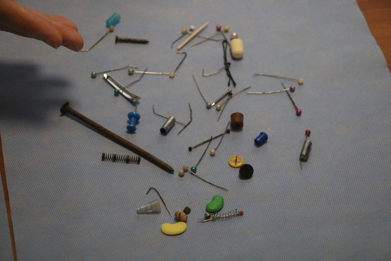 Şahin, yaptıkları koleksiyonda en çok 13 santimetrelik çivinin dikkat çektiğini belirterek, "Bu gördüğünüz çivi yaklaşık 12-13 santimetre civarında. Bunu aspire eden hastamızın boynunda kalıcı bir trakeostomisi var. İçinde de gümüş kanülü var. Normal şartlarda hastamızın bunu çıkarıp temizlemesi gerekirken bulunduğu yerde bu çivi ile temizlemeye çalışıyor ve çivi elinden içeriye kaçırıyor. İlginç bir hikayesi var. Tabi dikkatli olmak lazım" şeklinde konuştu.