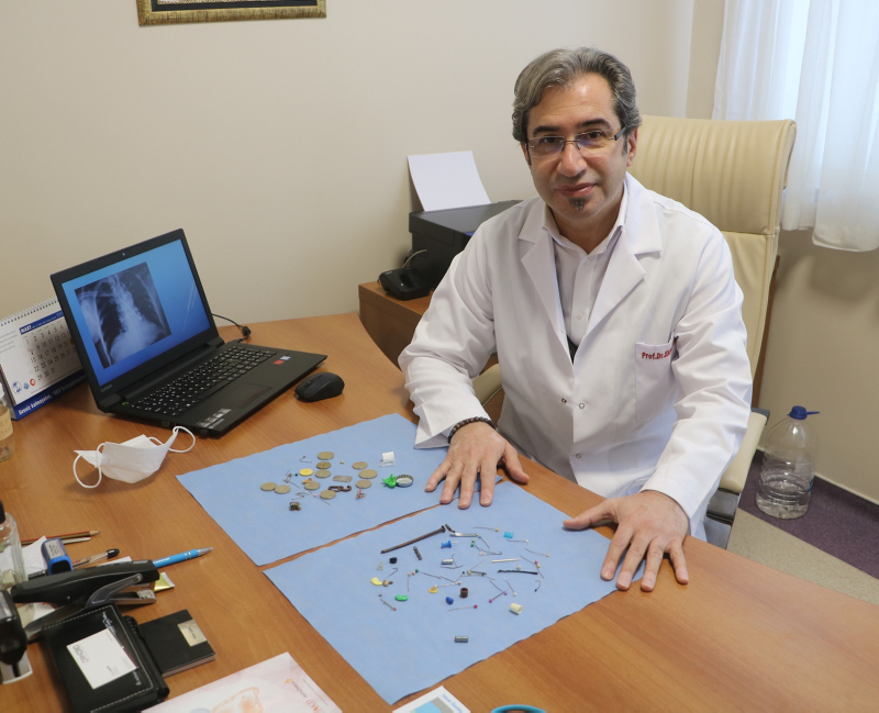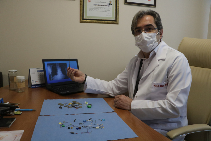 Bulunduruyorlarsa da çok dikkatli olmaları ve çocuklarından uzak tutmaları lazım. Örneğin çıkarttığımız ilginç parçalardan bir tanesi tespih tanesidir. Çocuk ölmek üzereyken bize geldi, şükür kurtuldu. Sadece çocuk yaşlarda görmüyoruz ileri yaşlarda da bu tür durumları görebiliyoruz. İleri yaşlarda hastalarımızın diş protezlerinin kırılıp aspire edildiğini ve yutulduğunu görebiliyoruz. Dişleri olmadıkları için ağızlarına aldıkları kemikli bir parçanın yemek borusunu tıkadığını görebiliyoruz. İlginçtir ilaç tabletini soluk borusundan çıkarttığımızı bilirim. Soluk borusundan kemikli et parçasını çıkarttığımızı bilirim" diye konuştu.