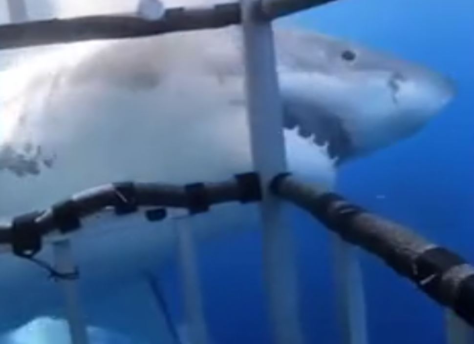 Görüntüde, kafese yaklaşan köpek balığının metal kafesi ısırdığı ve bir süre sonra kafesten uzaklaştığı görüldü.
