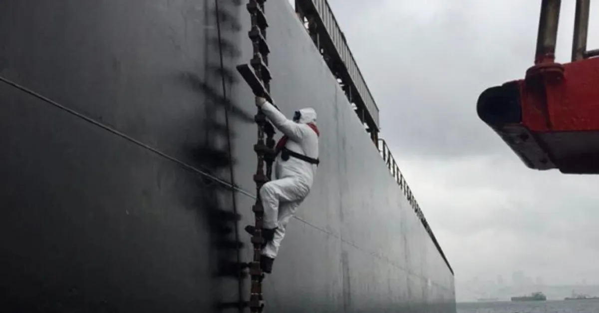 Koronavirüse karşı tulum giyip ve maske takan ekipler, gemiye çıktı.